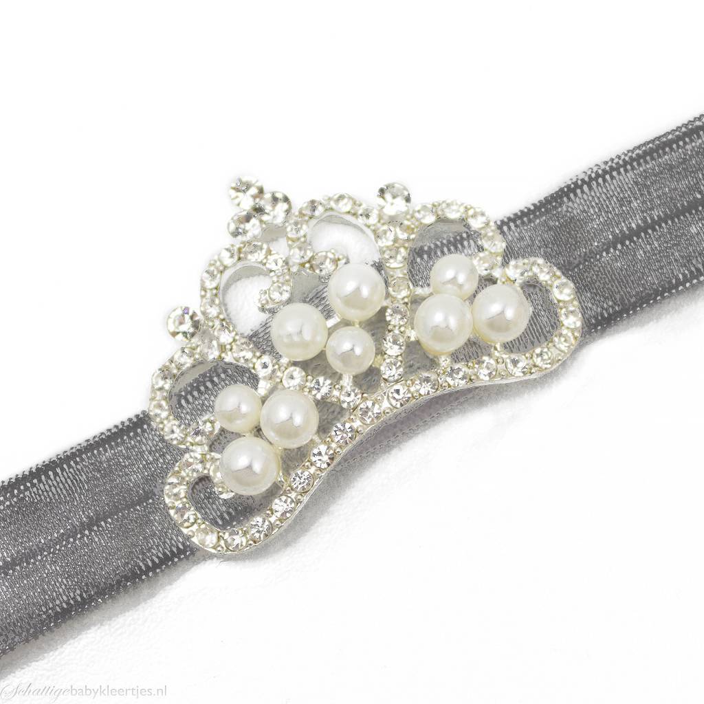 - Dit haarbandje heeft een bandje met mooie glittertjes erop. Op het bandje zit een tiara gemaakt van verzilverd materiaal met strass steentjes en 9 witte pareltjes.