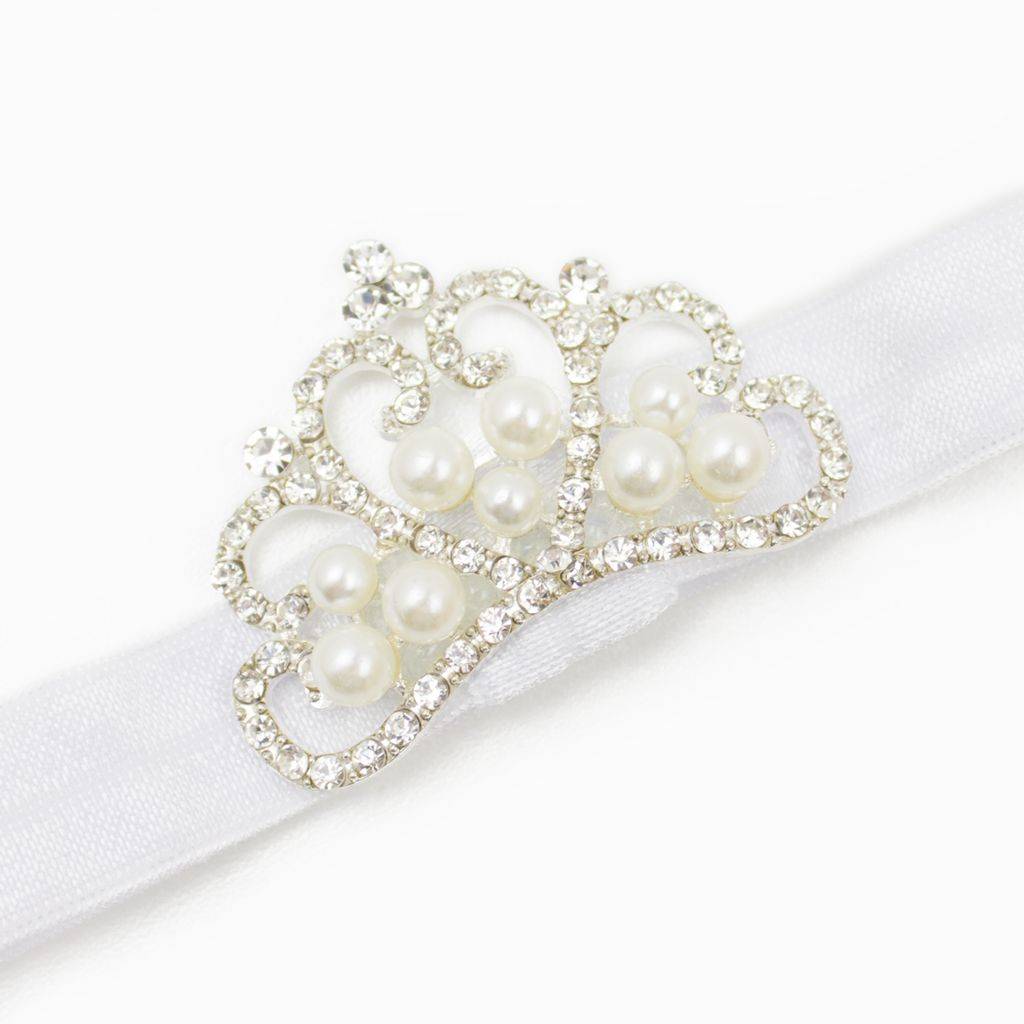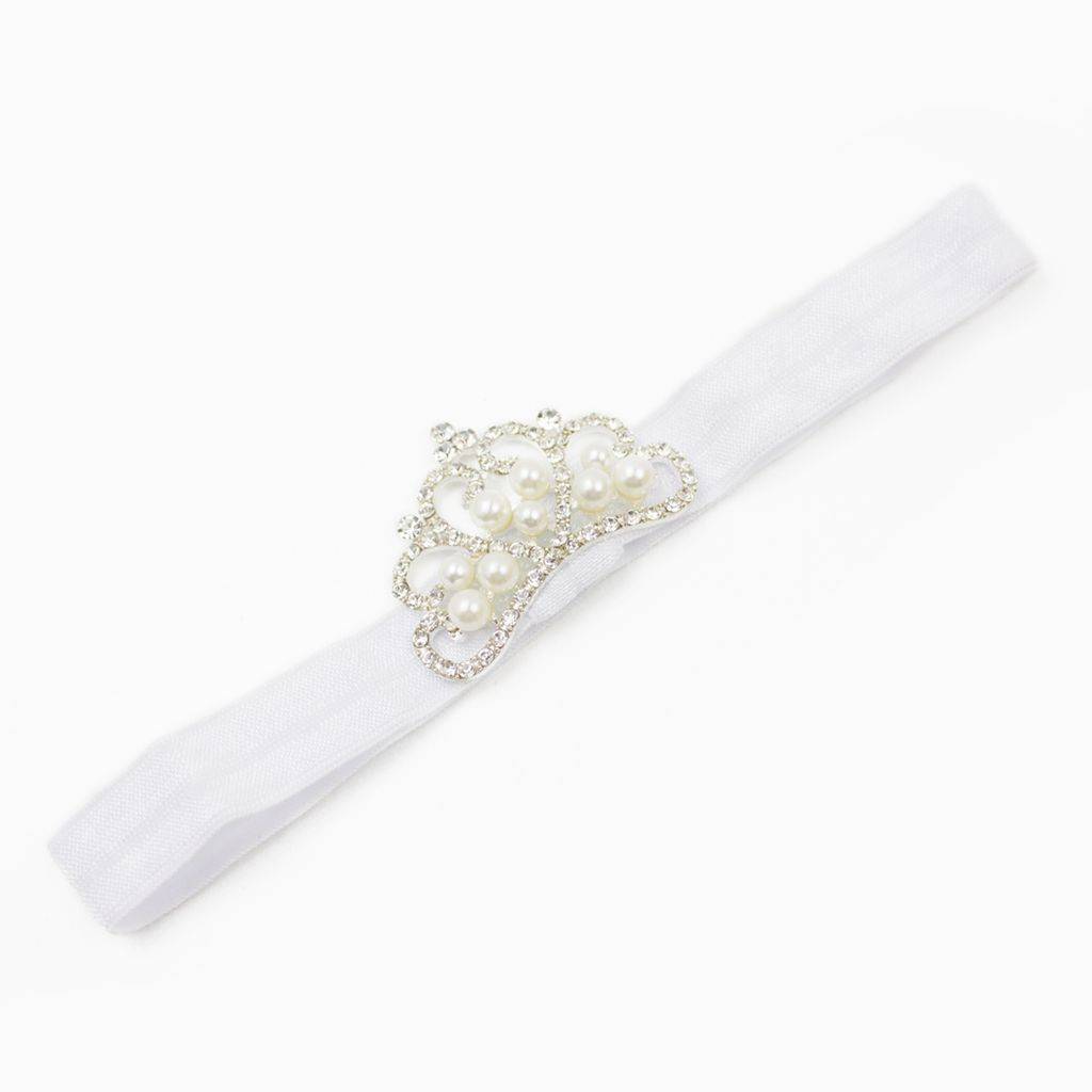 - Dit haarbandje heeft een bandje met mooie glittertjes erop. Op het bandje zit een tiara gemaakt van verzilverd materiaal met strass steentjes en 9 witte pareltjes.