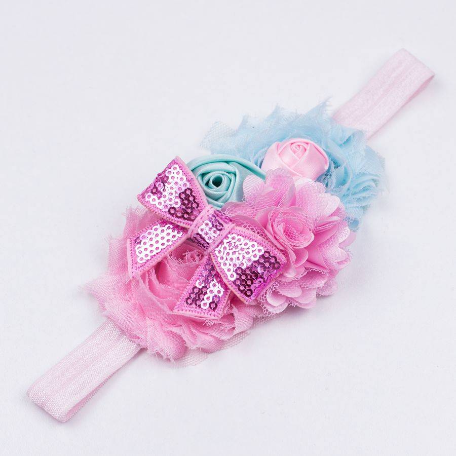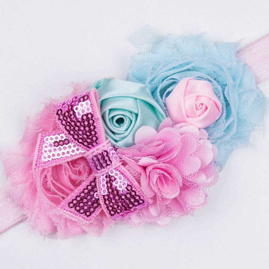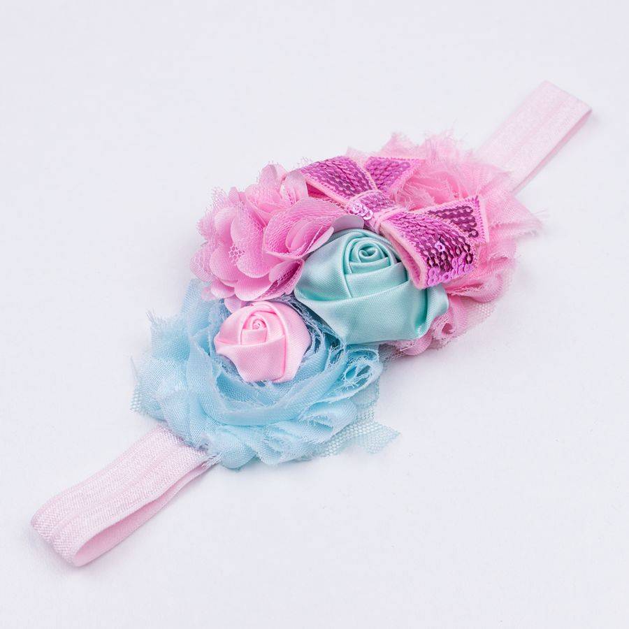 - Het cluster aan bloemen is 11 cm lang over het bandje heen en max 6 cm breed. Het bestaat uit een lichtblauwe shabby bloem met daarop een klein, satijnen, lichtroze roosje. Daarnaast zit een mintkleurig satijnen roos en een lichtroze bloem gemaakt van satijnen tule. Daarnaast zit weer een lichtroze shabby bloem met daarop een lichtroze glitter strik.