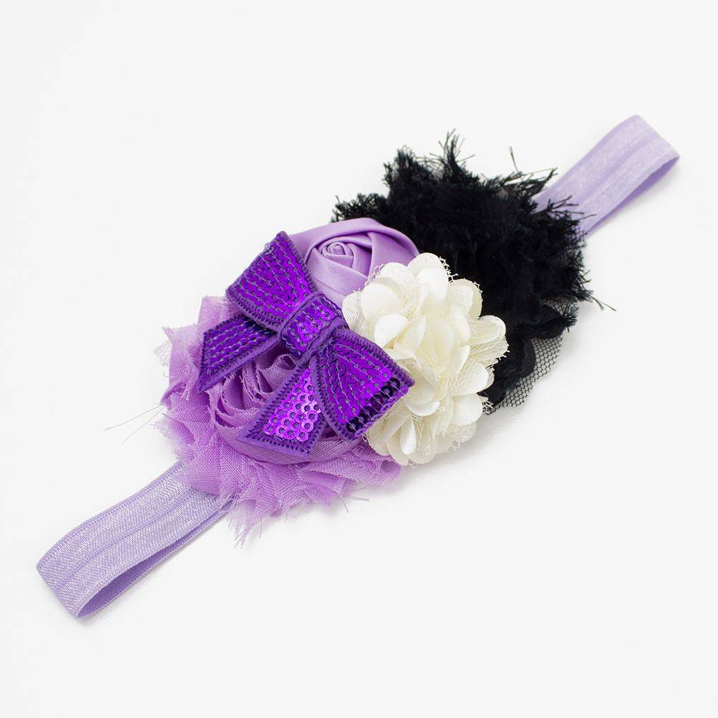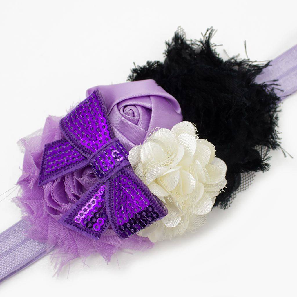- Het cluster aan bloemen is 11 cm lang over het bandje heen en max 6 cm breed. Het bestaat uit een lila shabby bloem met daarop een paarse glitterstrik. Daarnaast zit een lila satijnen roos en een ivoorkleurige bloem gemaakt van satijn en tule. Daarnaast zit weer een shabby bloem, donkerpaars.