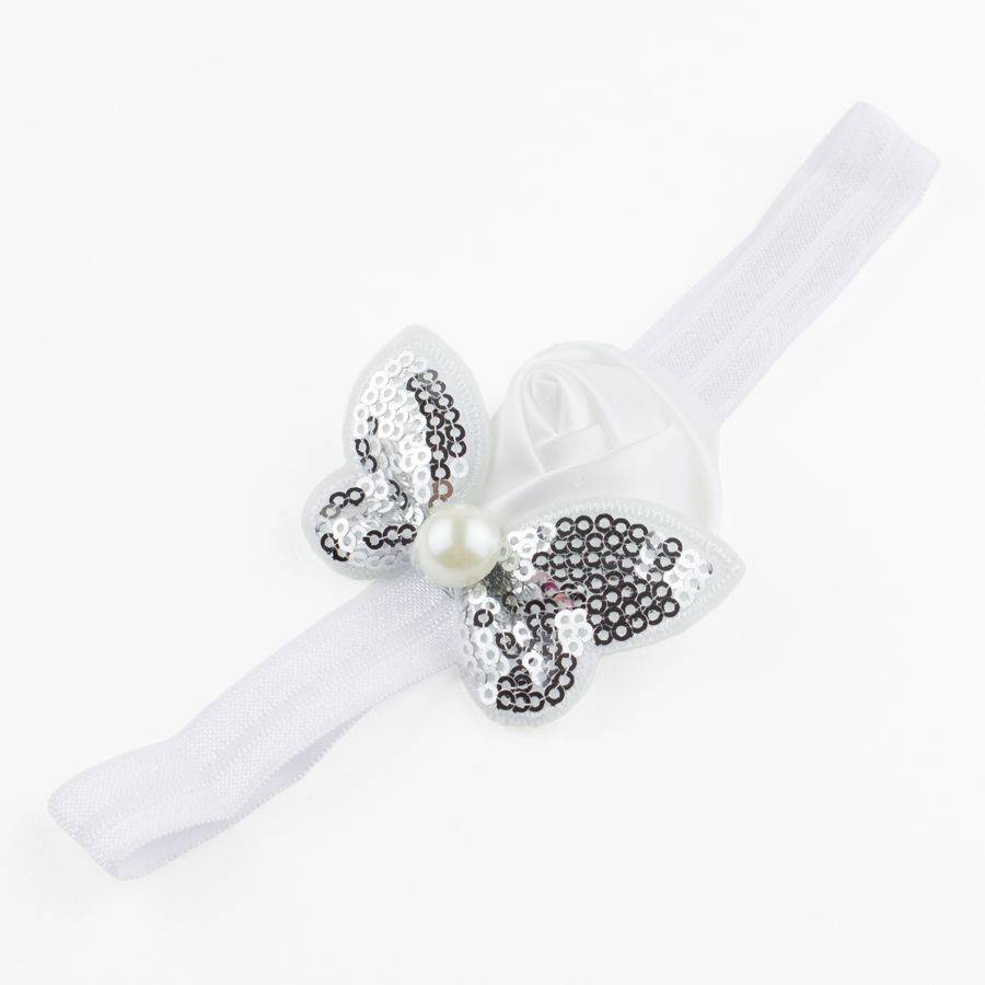 - Mooi haarbandje met een roos en een glitter vlinder met parel op een wit bandje.
