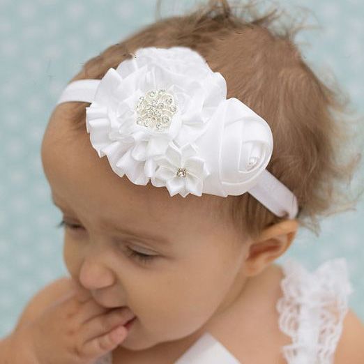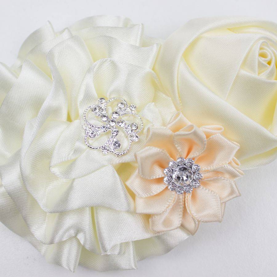 - De drie bloemen meten 11 cm over het bandje heen en zijn 8 cm breed. De eerste bloem is een grote roset bloem, gemaakt van satijnen laagjes met een grote strass applicatie in het hart. De twee bloem is een grote satijnen roos. De derde bloem is een klein margrietje met fijne bloemblaadjes en in het hart een strass steentje. Het margriet is schuin over hde roset en roos heen geplaatst.
