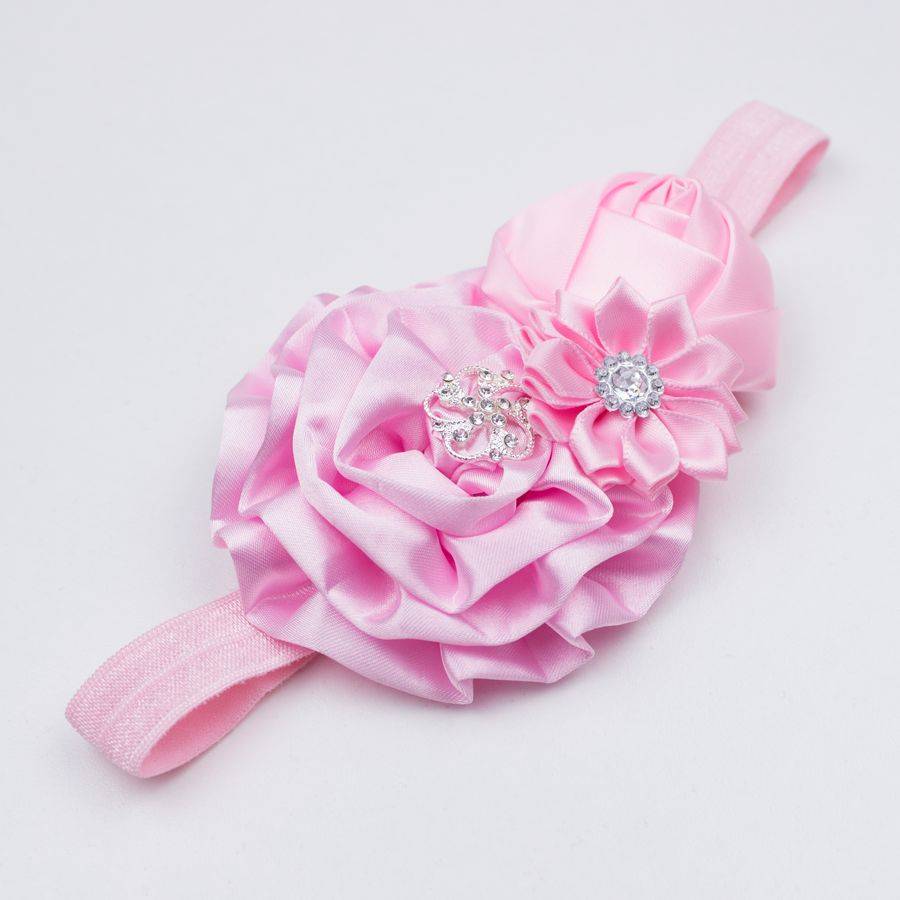 - Lief haarbandje met drie lichtroze bloemen bloemen op een lichtroze haarbandje.