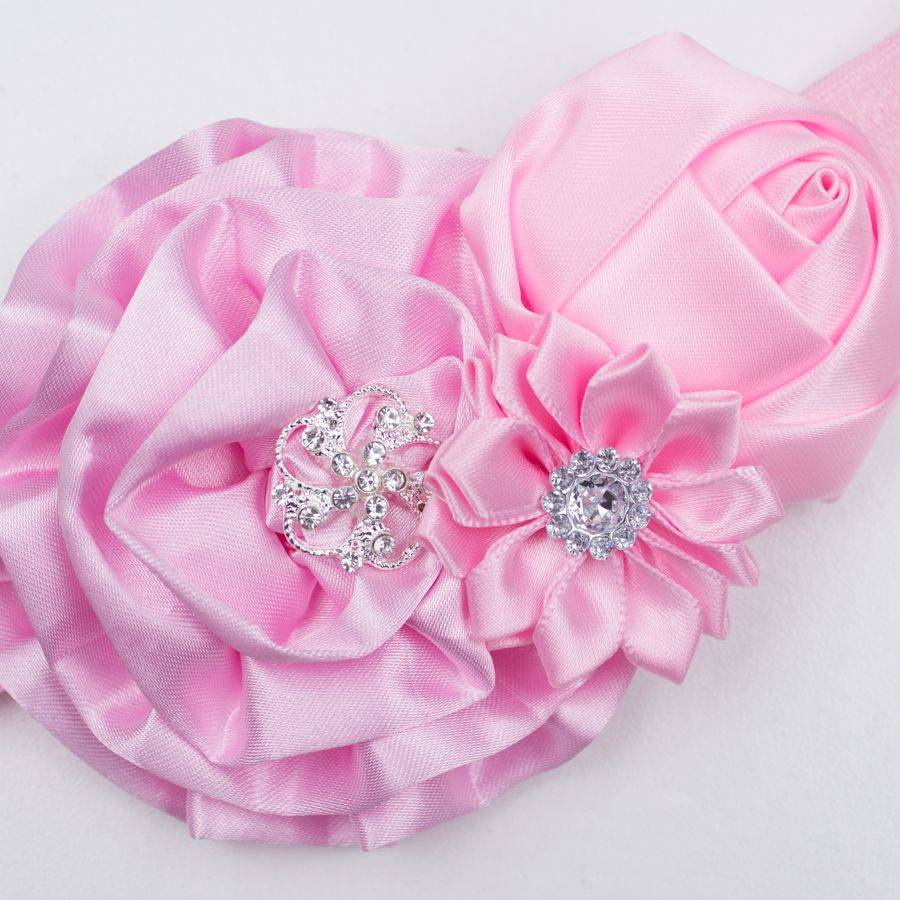 - De drie bloemen meten 11 cm over het bandje heen en zijn 8 cm breed. De eerste bloem is een grote roset bloem, gemaakt van satijnen laagjes met een grote strass applicatie in het hart. De twee bloem is een grote satijnen roos. De derde bloem is een klein margrietje met fijne bloemblaadjes en in het hart een strass steentje. Het margriet is schuin over hde roset en roos heen geplaatst.