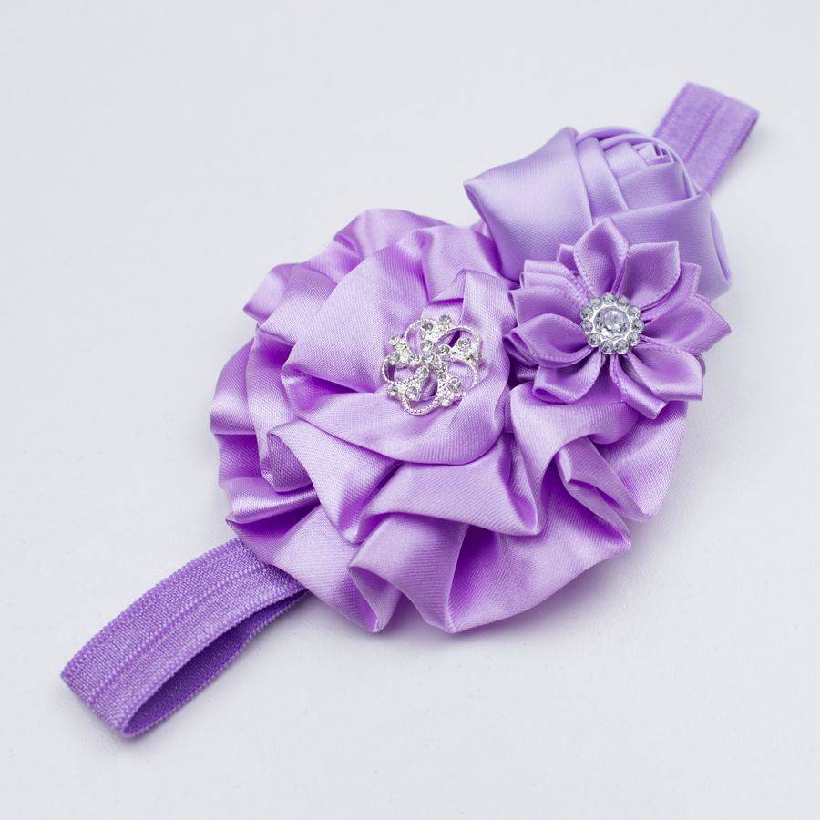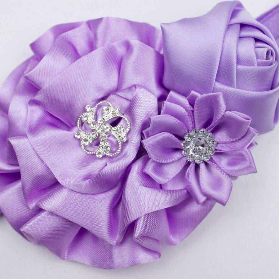 - Lief haarbandje met drie lila bloemen bloemen op een lila haarbandje.
