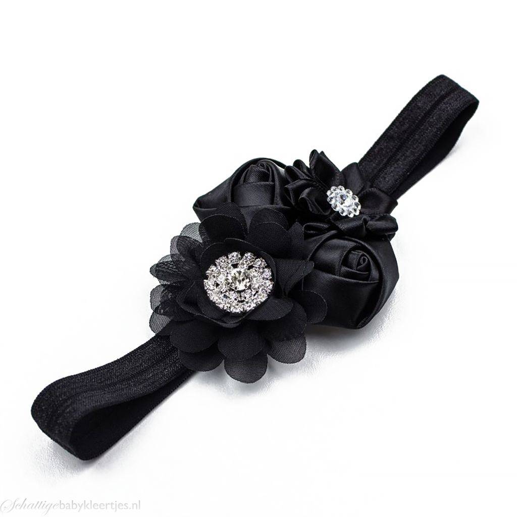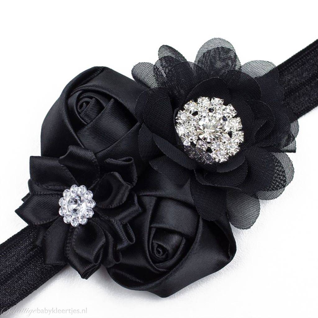 - Op dit bandje zitten vier bloemen. Eén bloem met fijne bloemblaadjes is van satijn met een strass steentje in het hart van de bloem. Daarnaast zitten twee zwarte roosjes van satijn. De grote bloem is van zwart chiffon met een grote strass steentje in het hart.