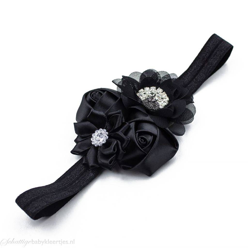 Baby haarbandje satijnen rozen en chiffon bloem (zwart)