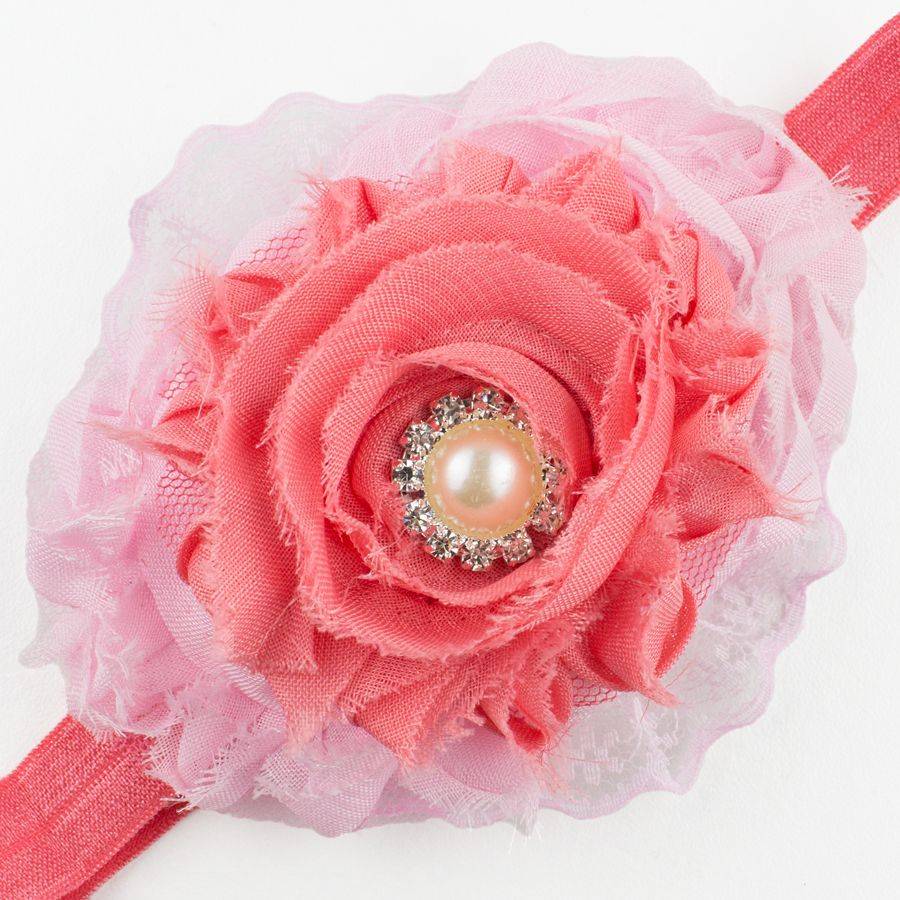 - Dit is een prachtig haarbandje met drie shabby bloemen op kant met parel en strass op een koraal haarbandje.