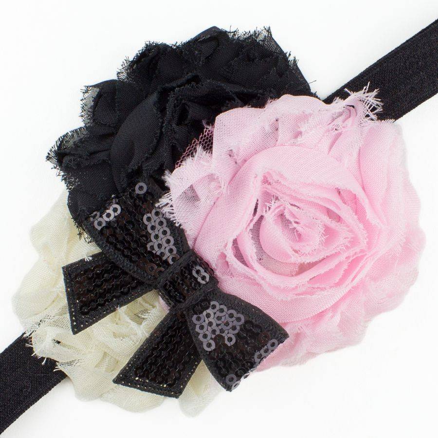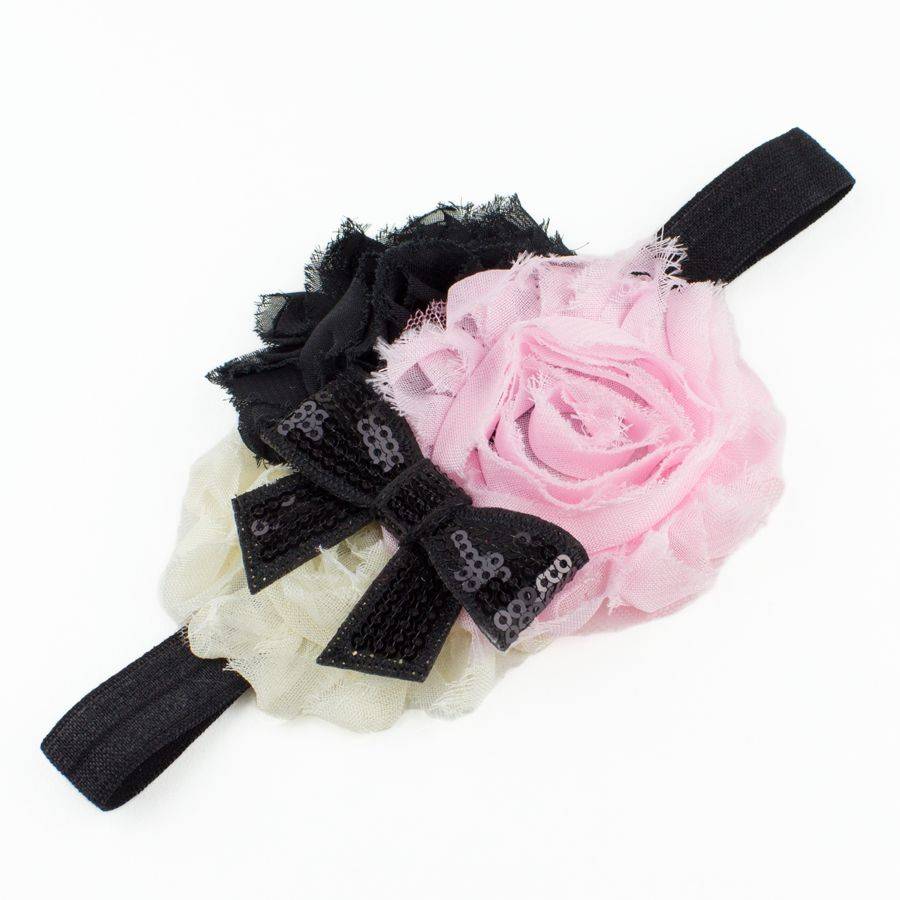 Baby haarbandje shabby bloemen met glitter strik (roze/ivoor/zwart)