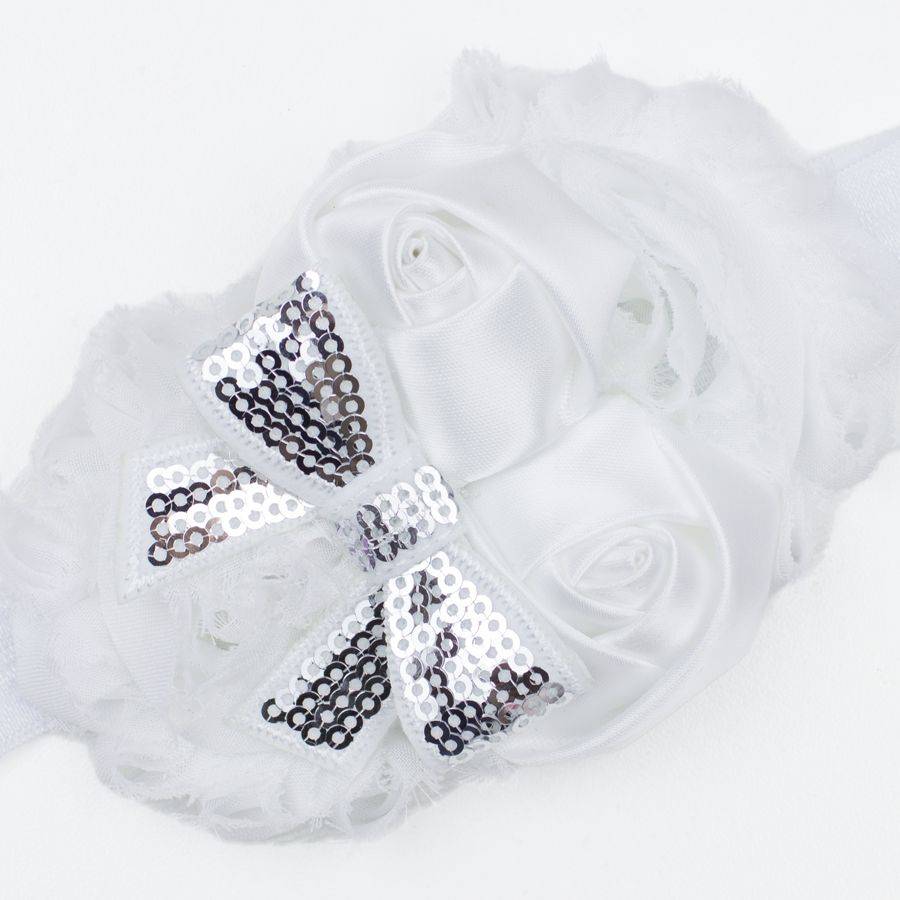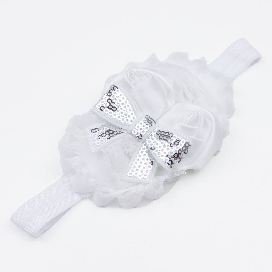 - De applicatie bestaat uit twee witte shabby bloemen met daarop twee witte, satijnen roosjes en een witte strik met pailletjes. De applicatie is 11 cm over het bandje heen en 6 cm breed.