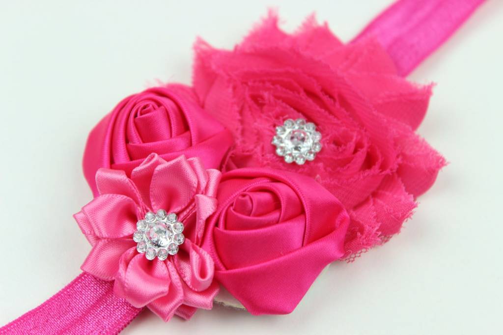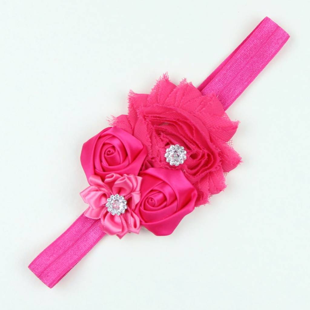 Baby haarbandje shabby/satijnen bloemen en strass fuchsia
