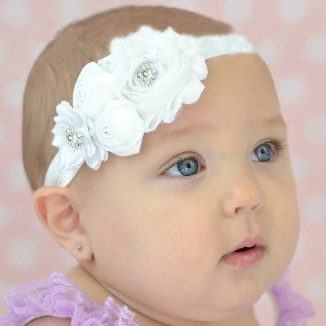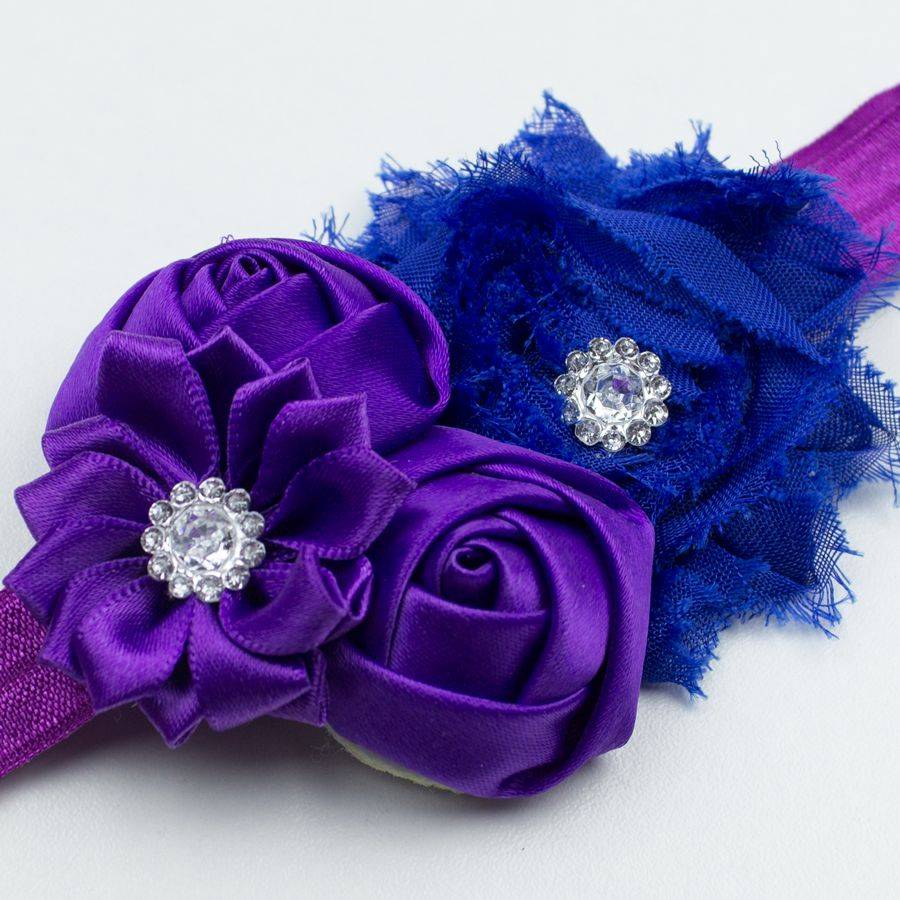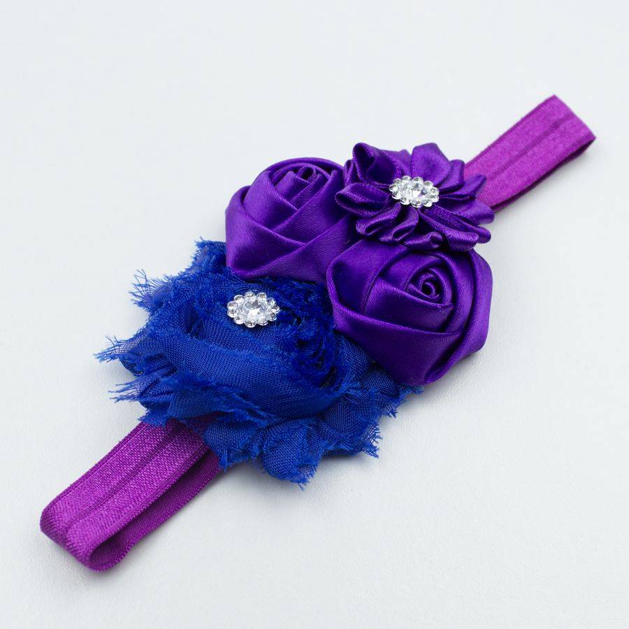 Baby haarbandje shabby/satijnen bloemen en strass paars/blauw