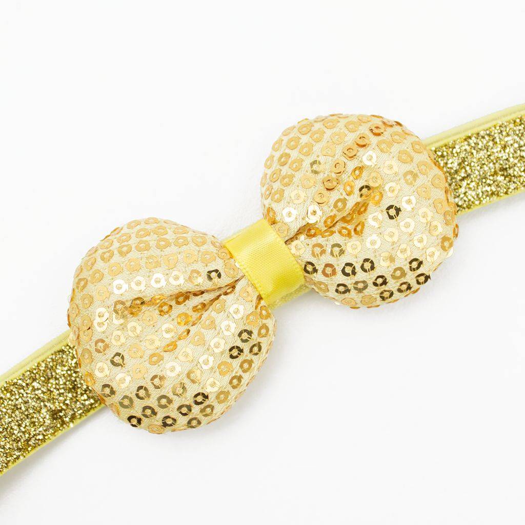 - Op het bandje is een goudkleurige strik van satijn bevestigd van 8 cm bij 4 cm. De strik is bezaaid met goudkleurige glitter pailletjes en dubbel uitgevoerd zodat hij volume heeft. Het knoopje van de strik is gemaakt van effen satijn.