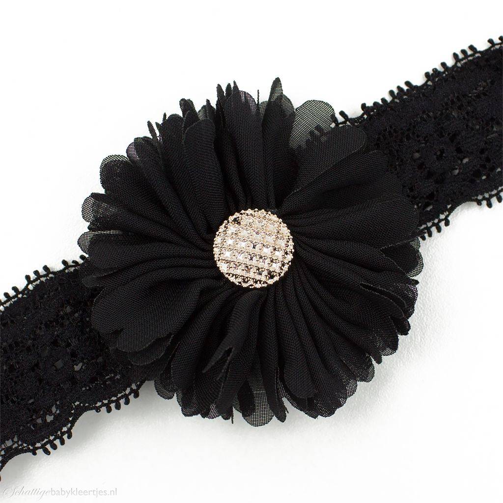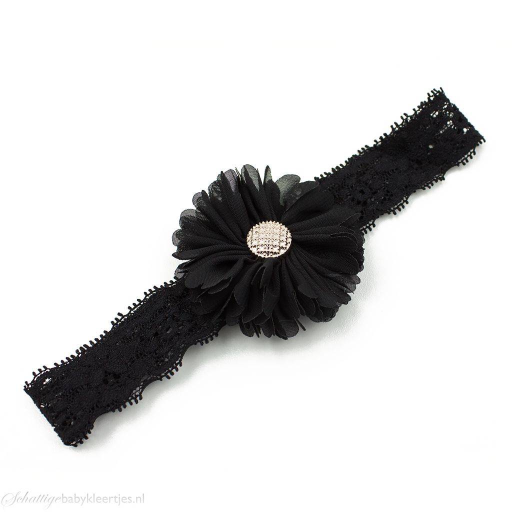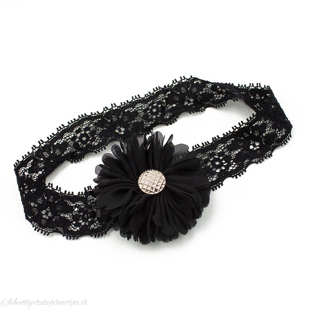 - Schattig haarbandje met een grote zwarte bloem op kanten bandje met bijzonder hart.