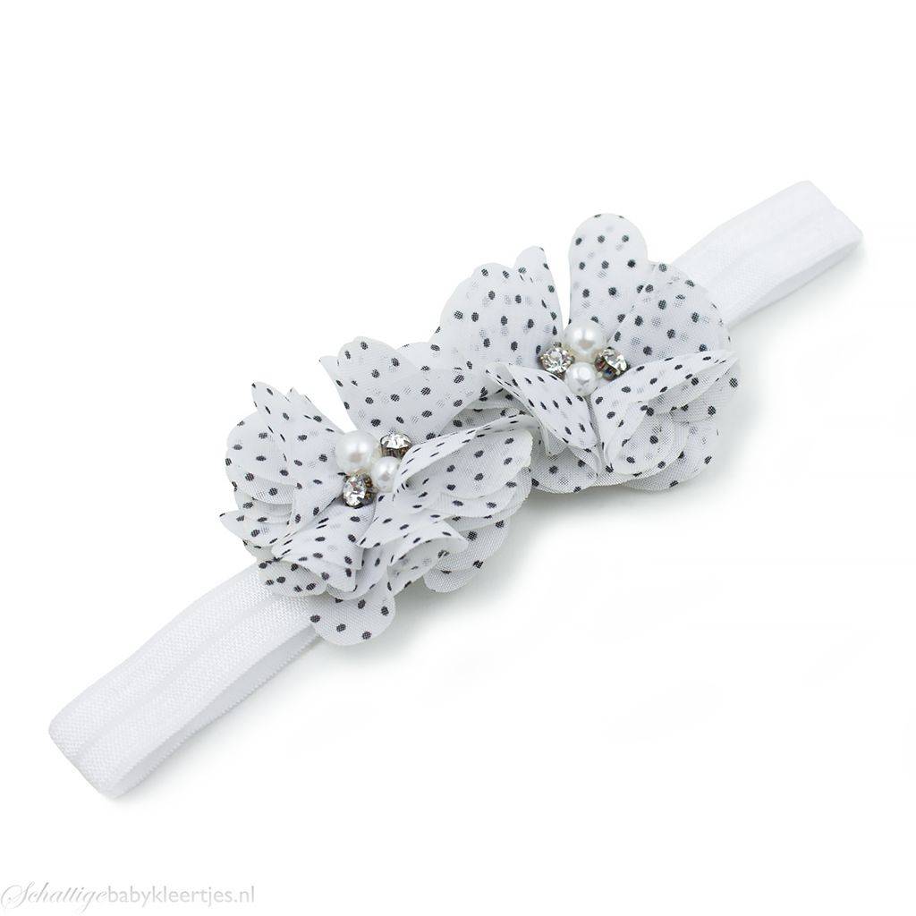 - Schattig haarbandje met twee witte chiffon bloemen met zwarte stippeltjes, pareltjes en strass.