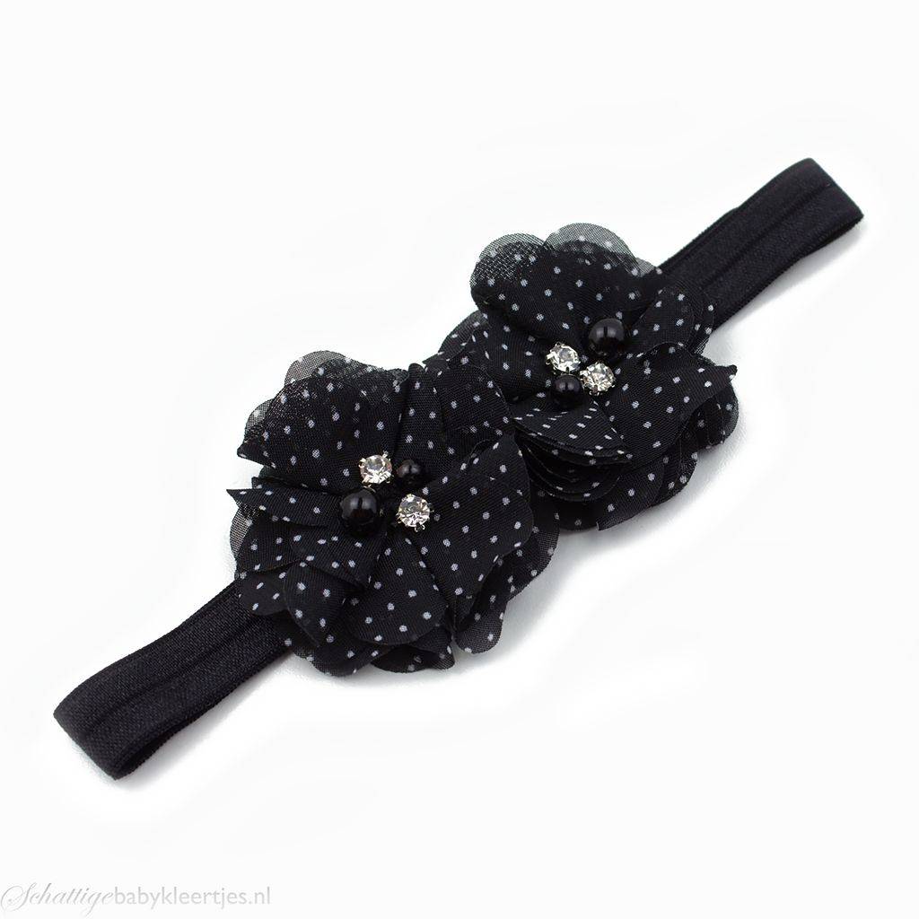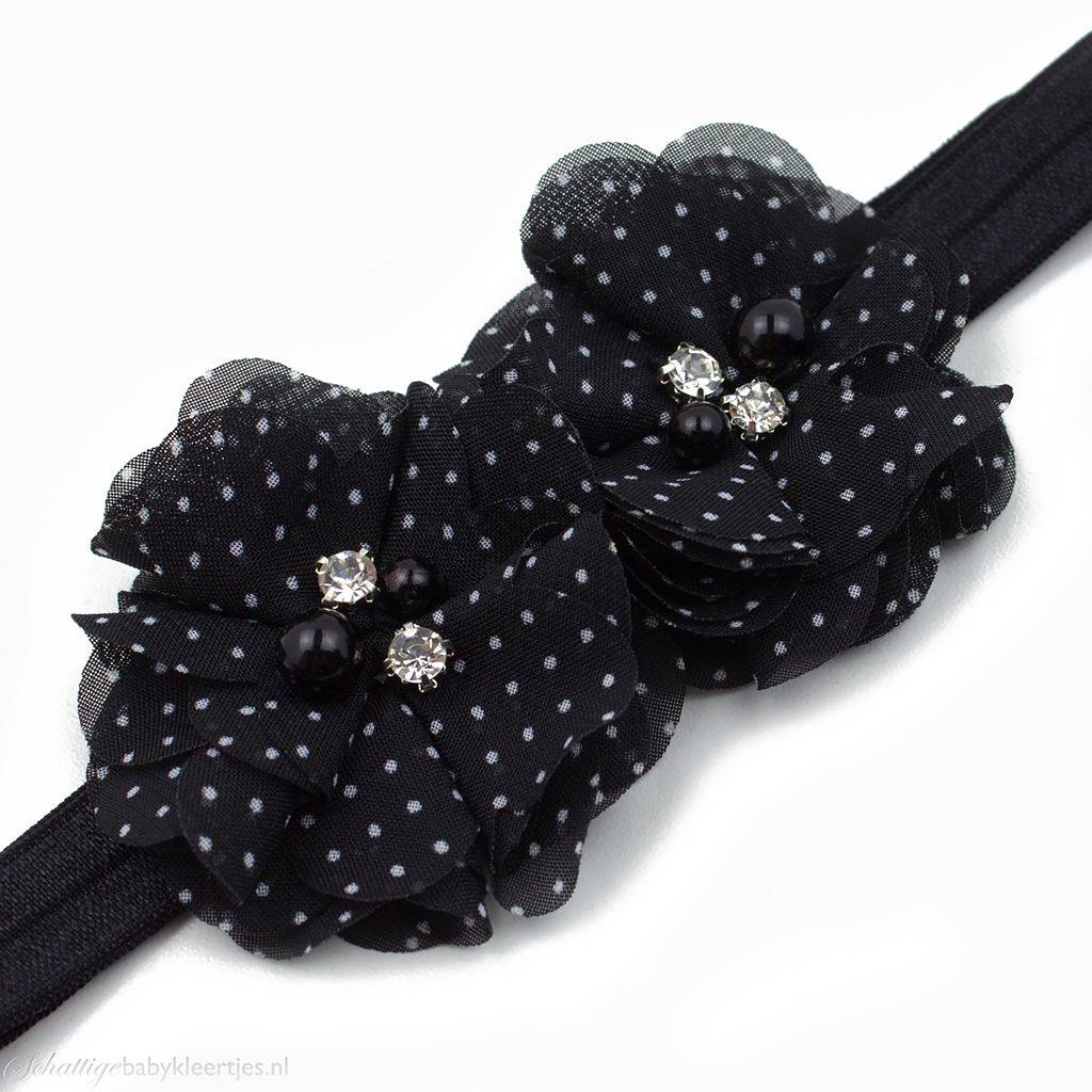 - Schattig haarbandje met twee zwarte chiffon bloemen met witte stippeltjes, pareltjes en strass.