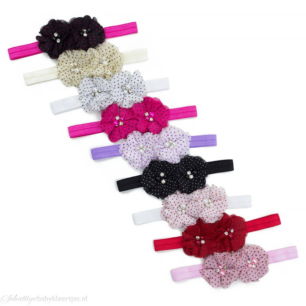 - Er zitten twee chiffon bloemen op het bandje: zwart met witte stipjes. In het hart van de bloemen zitten twee zwarte parels (een kleinetje en een grotere) en twee glimmende strass steentjes.