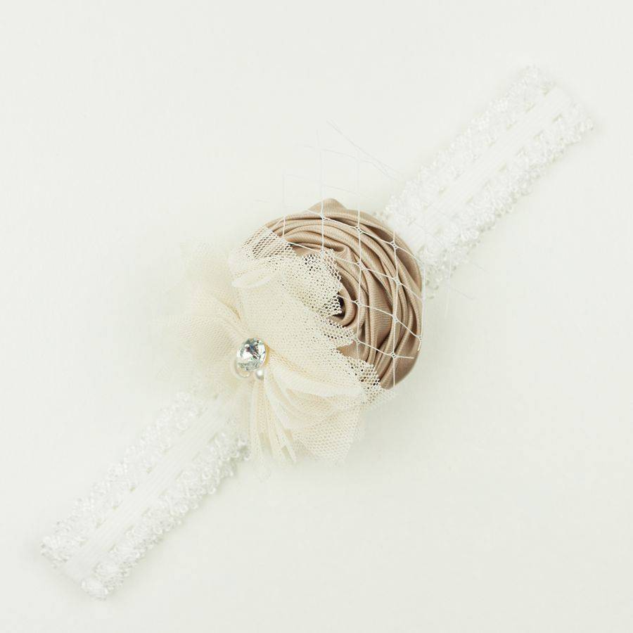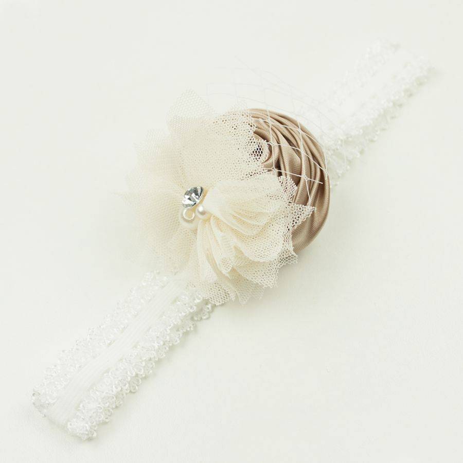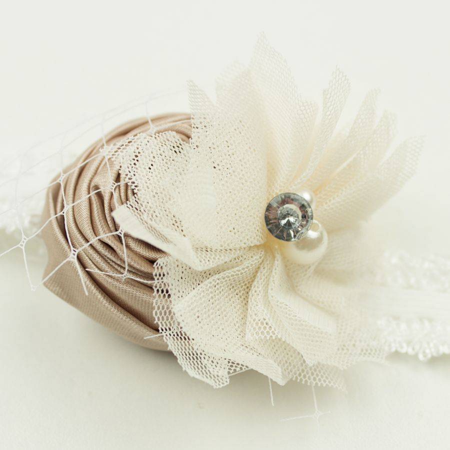 Baby kanten haarbandje met satijnen roos, tule bloem en voile (beige/ivoor)