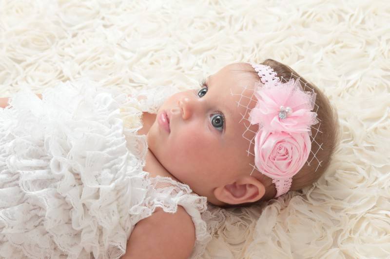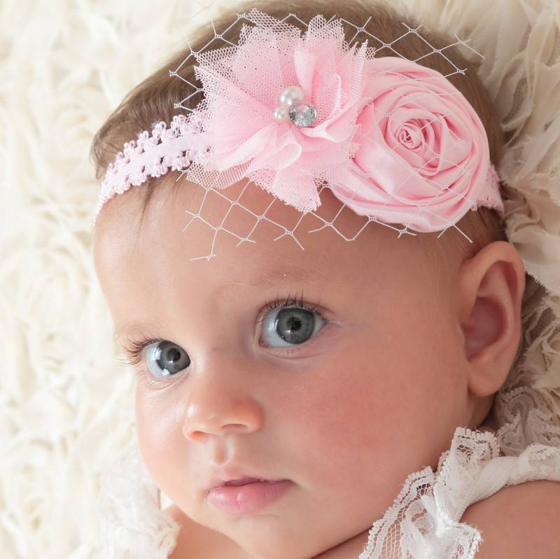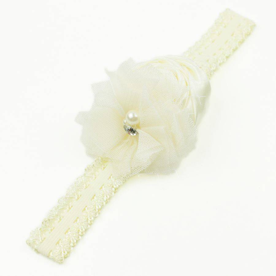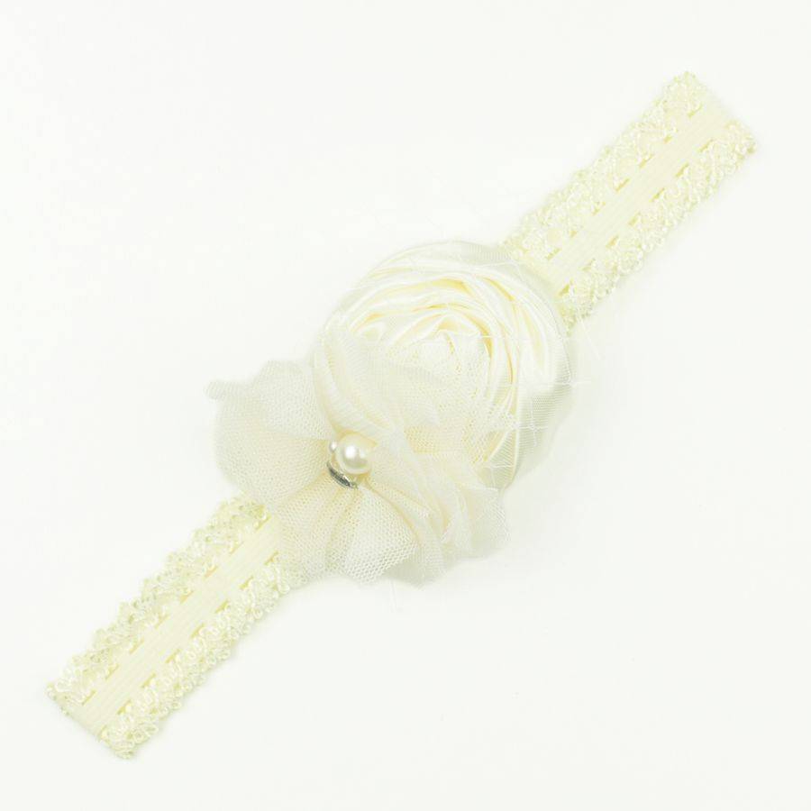 Baby kanten haarbandje met satijnen roos, tule bloem en voile (ivoor)