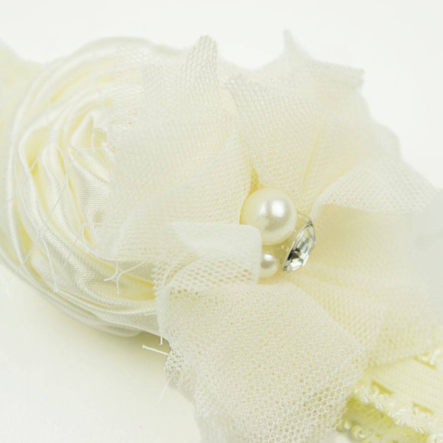 - Op het bandje zitten twee bloemen. Eén rond roosje van satijn en één ivoorkleurig tule bloemetje met twee pareltjes en een strass steentje in het hart. Over het satijnen bloemetje heen zit een klein stukje voile (gaasje), zoals vroeger wel aan dameshoedjes zat.