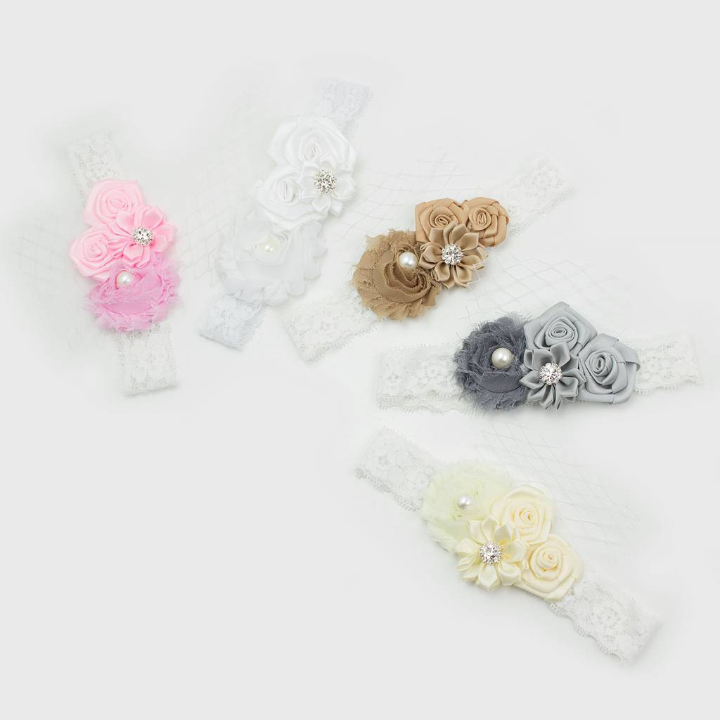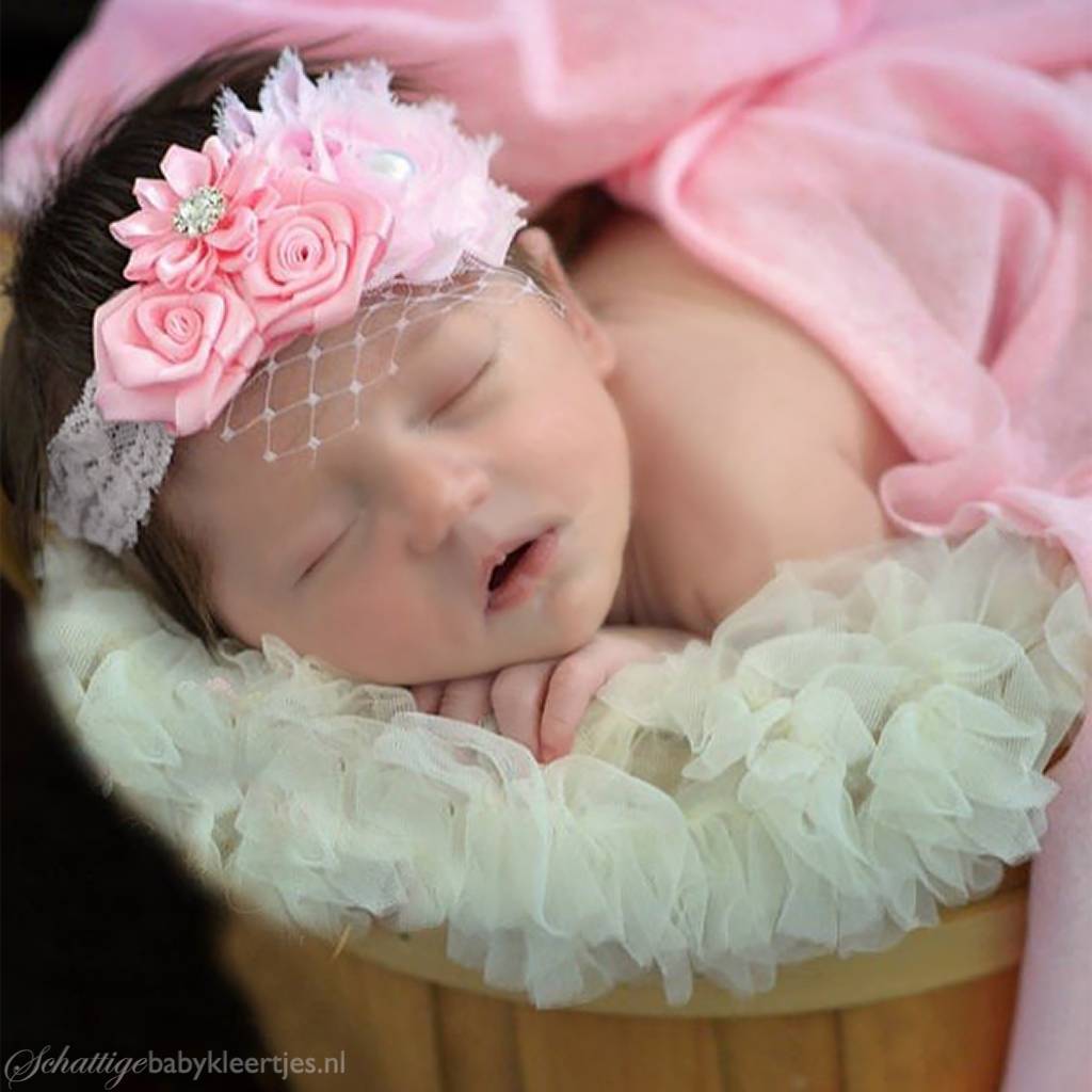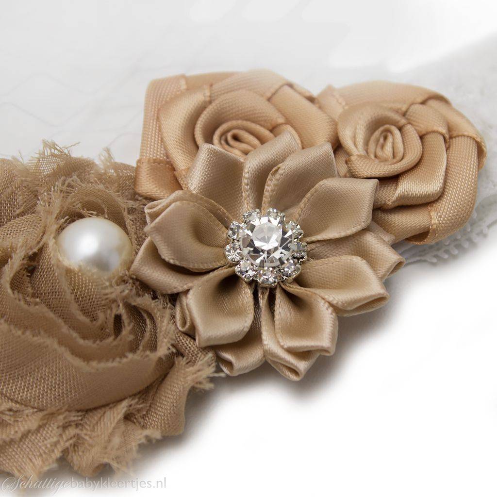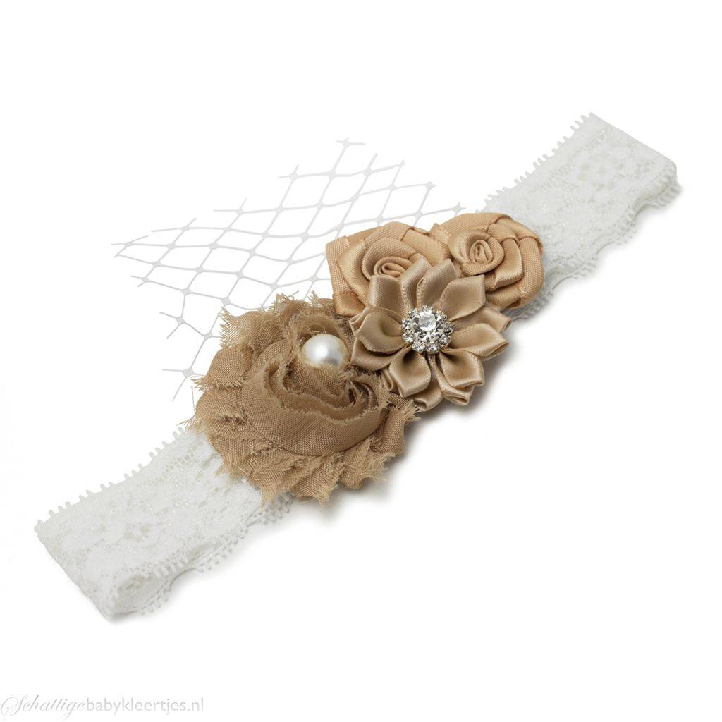 - Op het kanten haarbandje zijn vier bloemen bevestigd: één shabby bloem met een parel applicatie in het hart, twee satijnen gedraaide roosjes en een margriet met een grote strass steen in het hart. Er zit een witte voile half onder de bloemapplicatie, wat het een chique look geeft. De voile meet 8 cm en steekt 4 cm onder de bloemen uit.