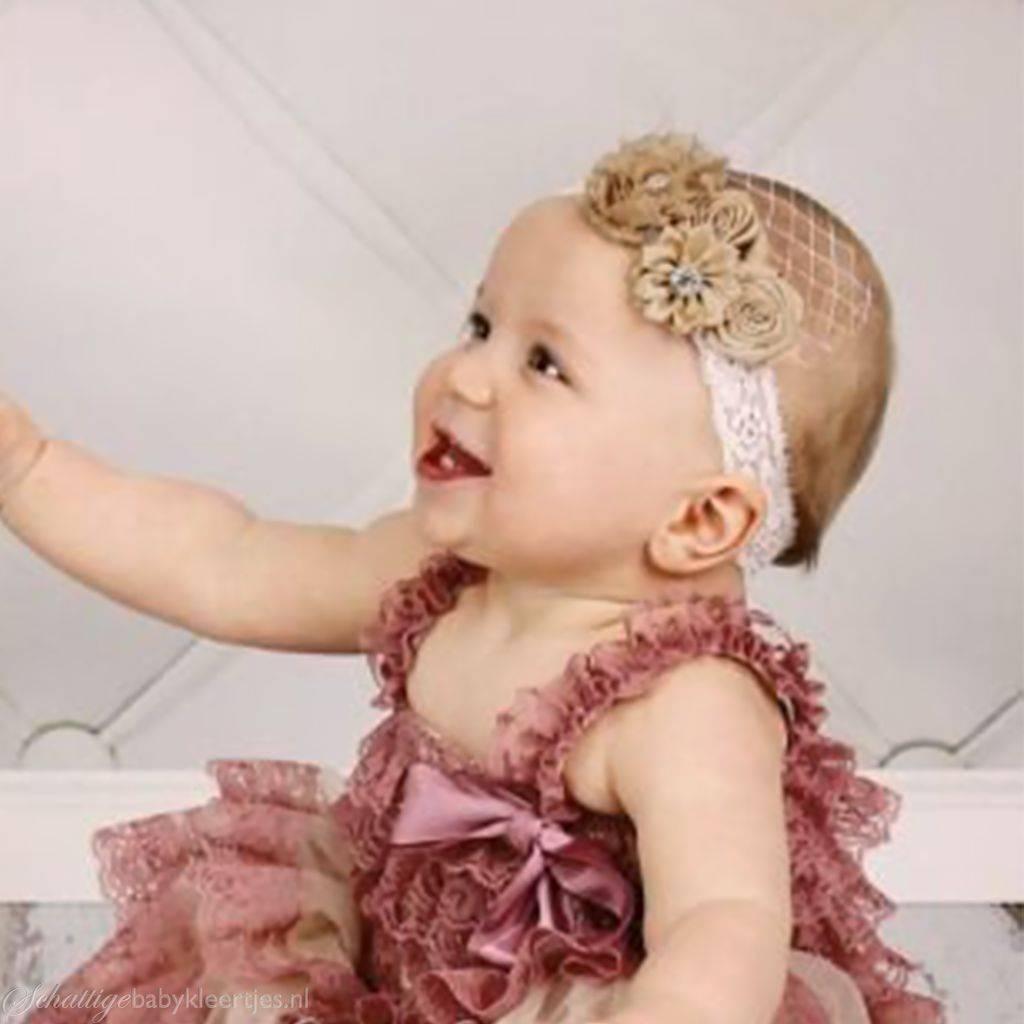 Baby haarbandje vier bloemen op kant (donkerzand)