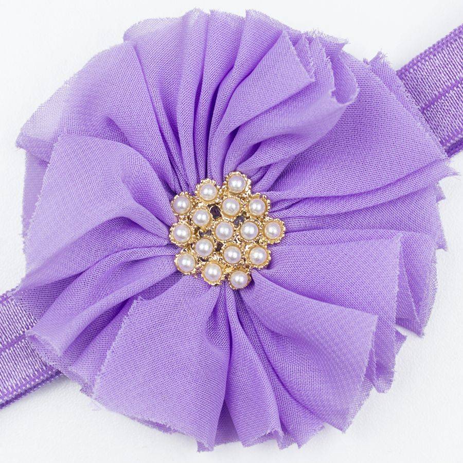 - Mooi haarbandje met een grote lila bloem op een rood haarbandje.