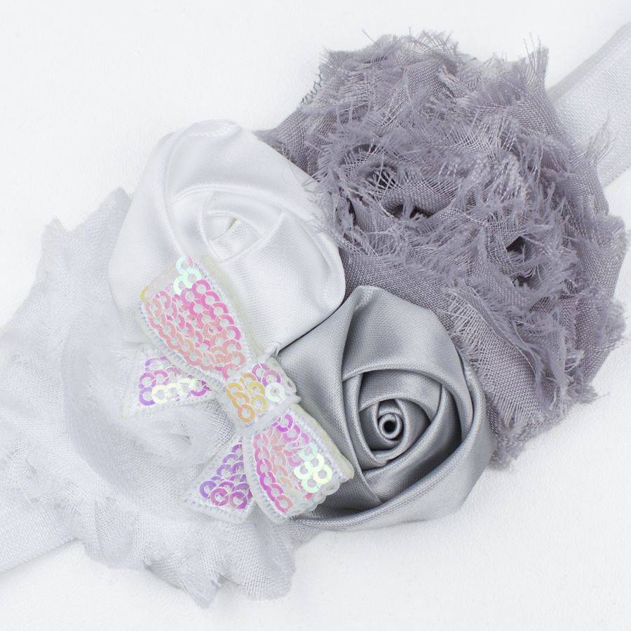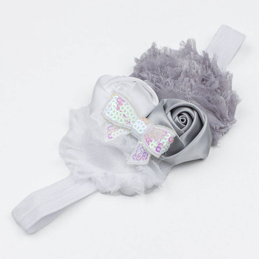 - Prachtig haarbandje in mooie kleurcombinatie: wit/grijs. Met bloemen en glitter strik.