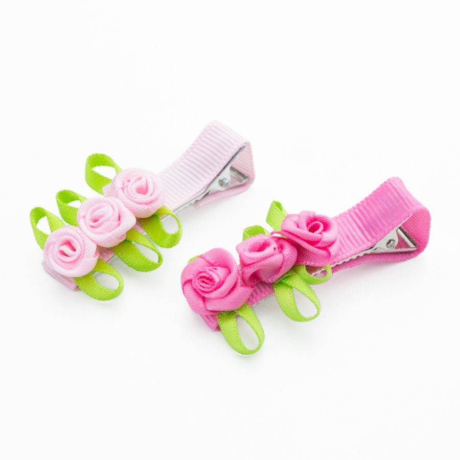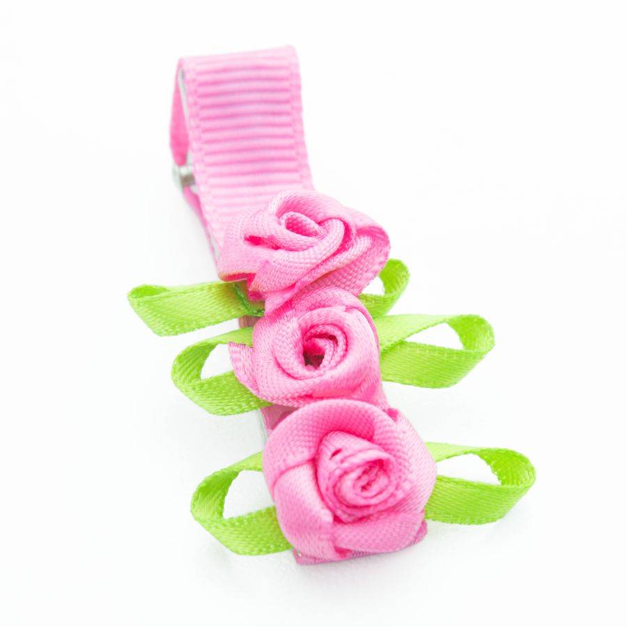 - Dit is een prachtig klein haarspeldje met drie kleine roosjes en groene bloemblaadjes daaromheen.