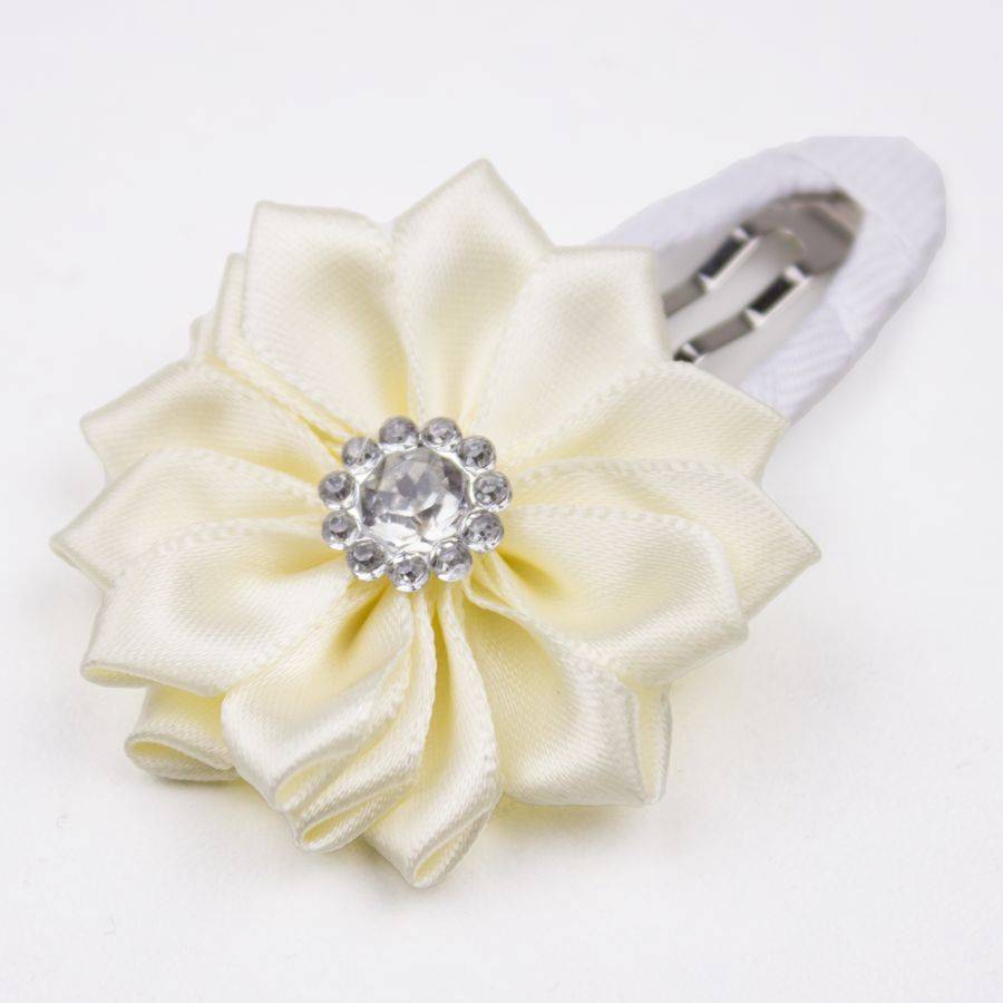 - Op het speldje is een ivoren, satijnen margrietje bevestigd. Het bloemetje is 4 cm in diameter. In het hart van het bloemetje zit een strass steentje met een diameter van 0,8 cm.