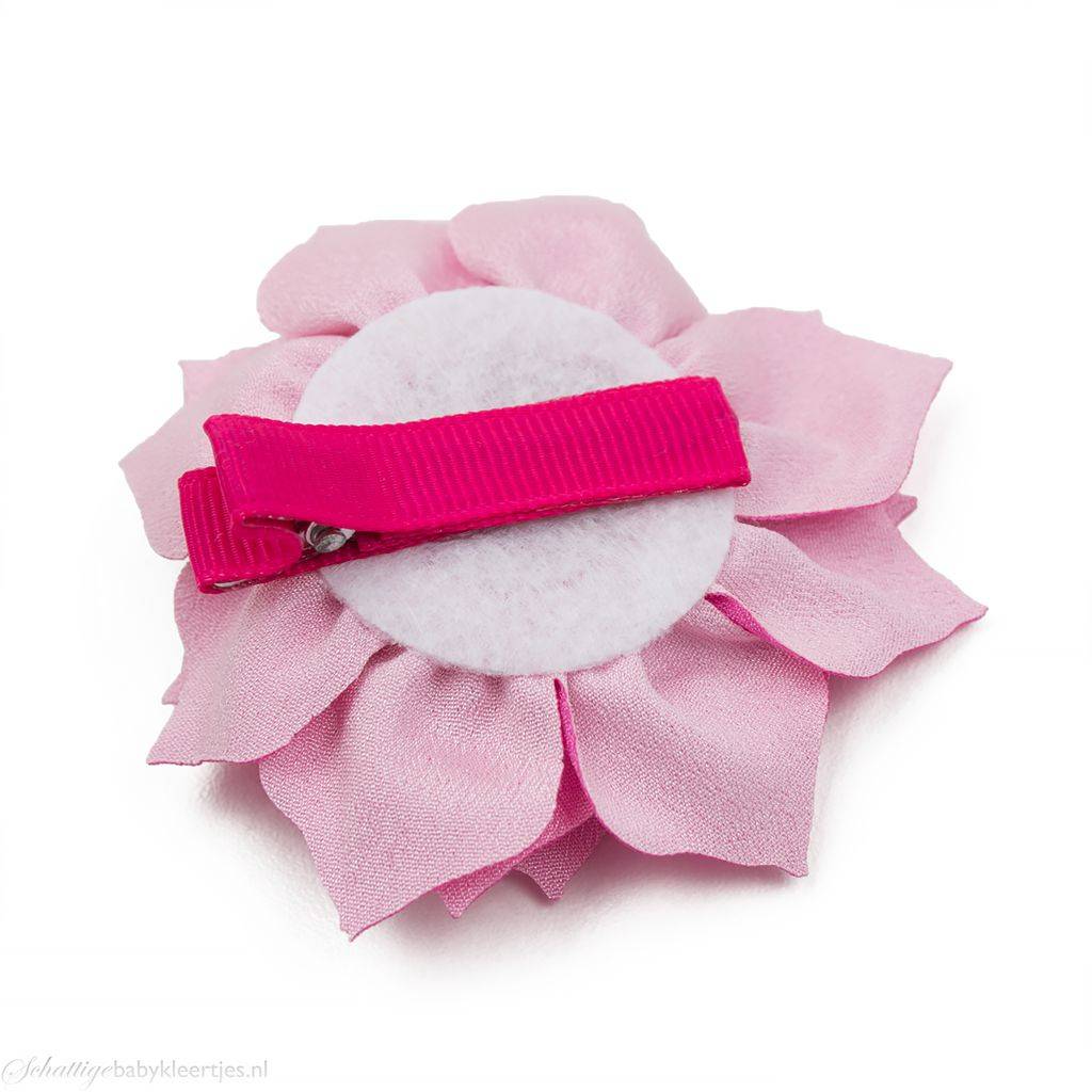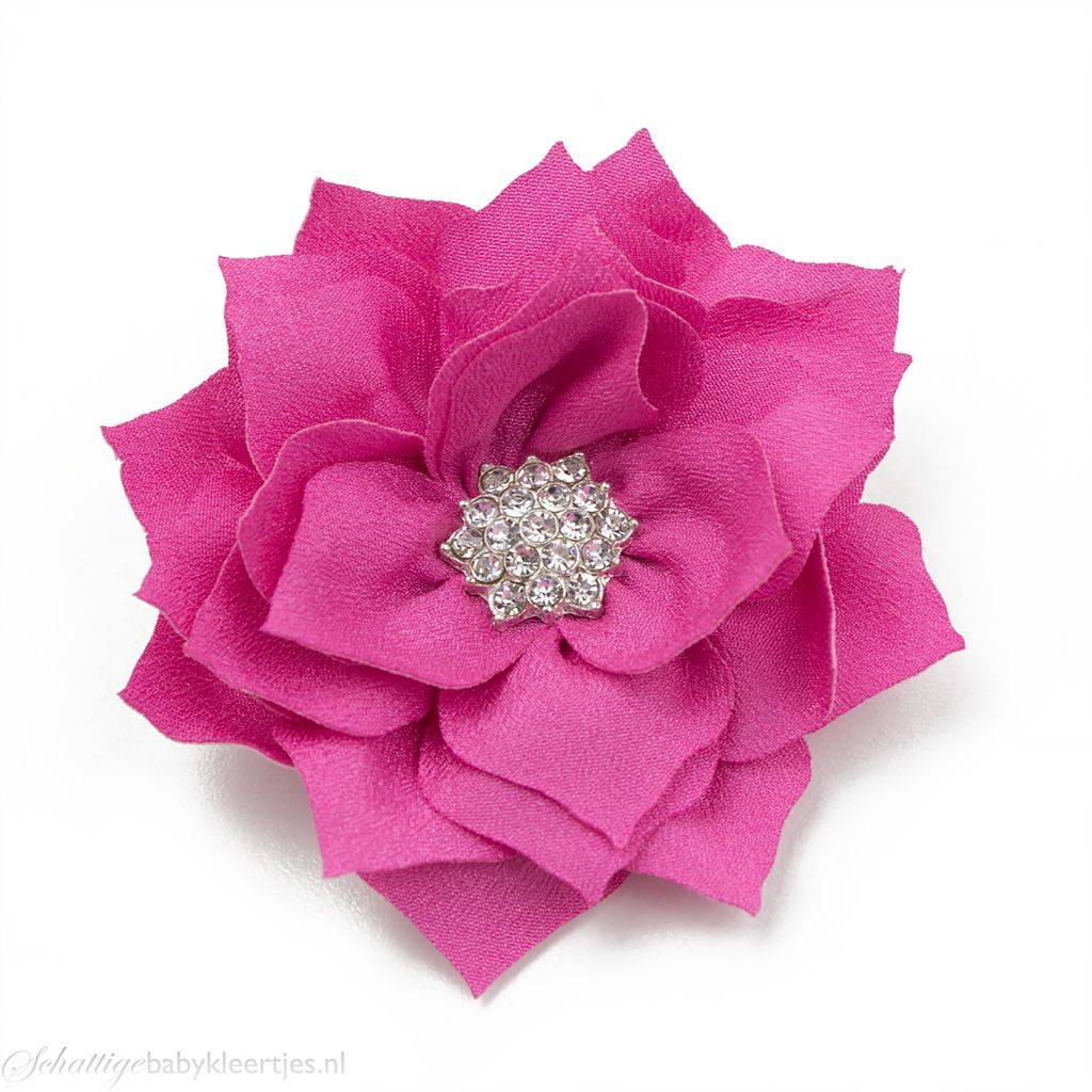 - Op het speldje is een roze, chiffon bloem bevestigd. De bloem is 8 cm in doorsnede. In het hart van de bloem zit een grote strass steen, een zogenaamde "starburst".