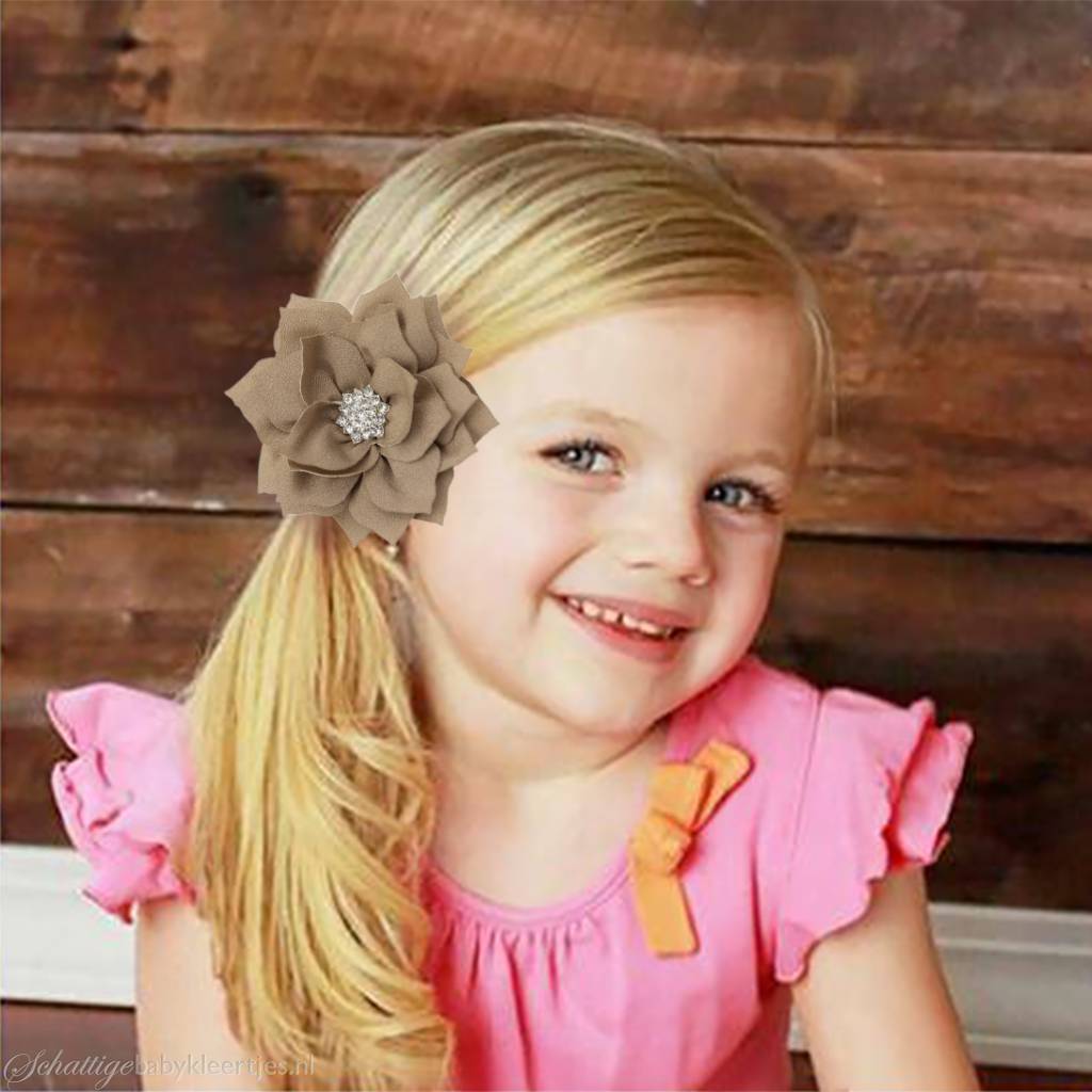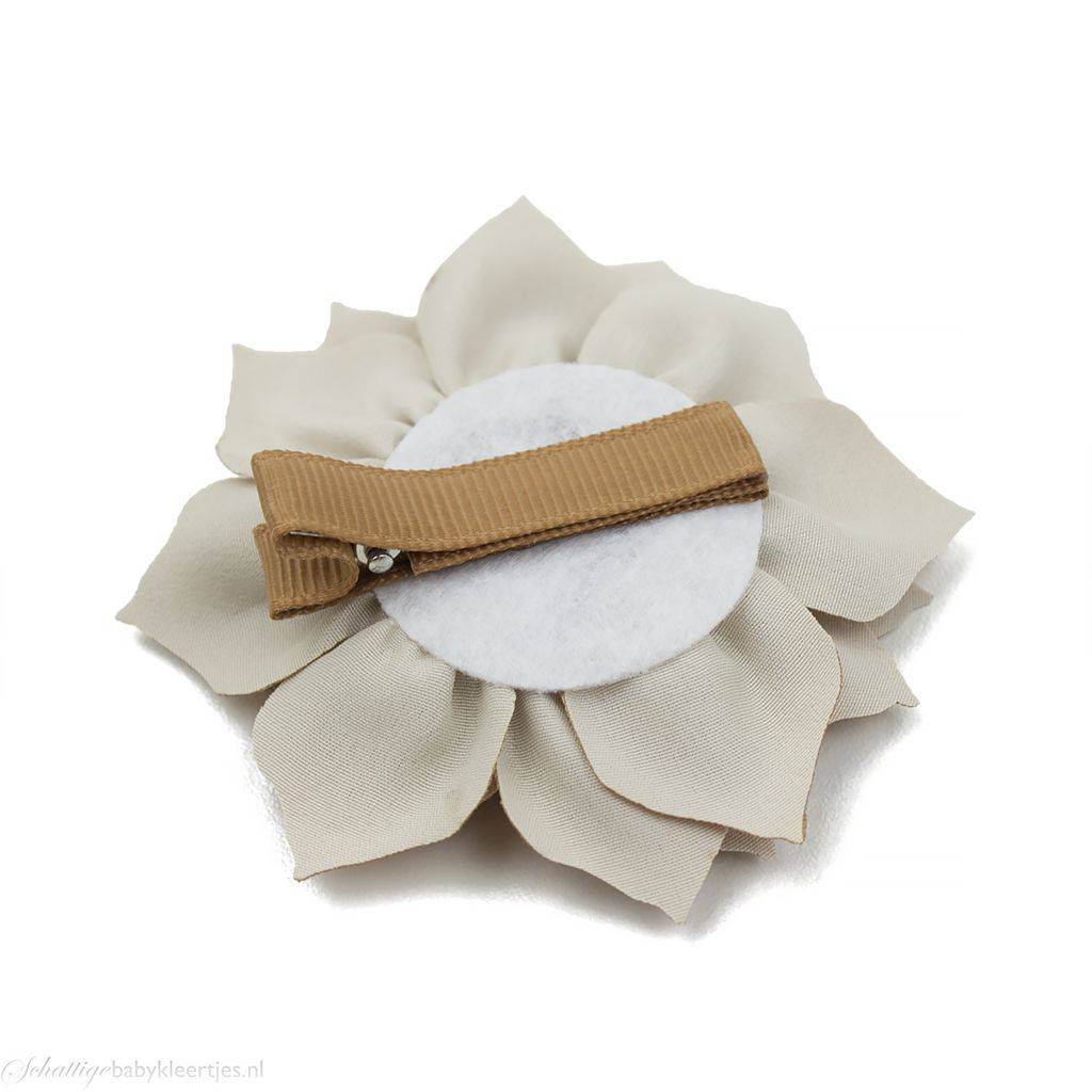 - Op het speldje is een zandkleurige, chiffon bloem bevestigd. De bloem is 8 cm in doorsnede. In het hart van de bloem zit een grote strass steen, een zogenaamde "starburst".