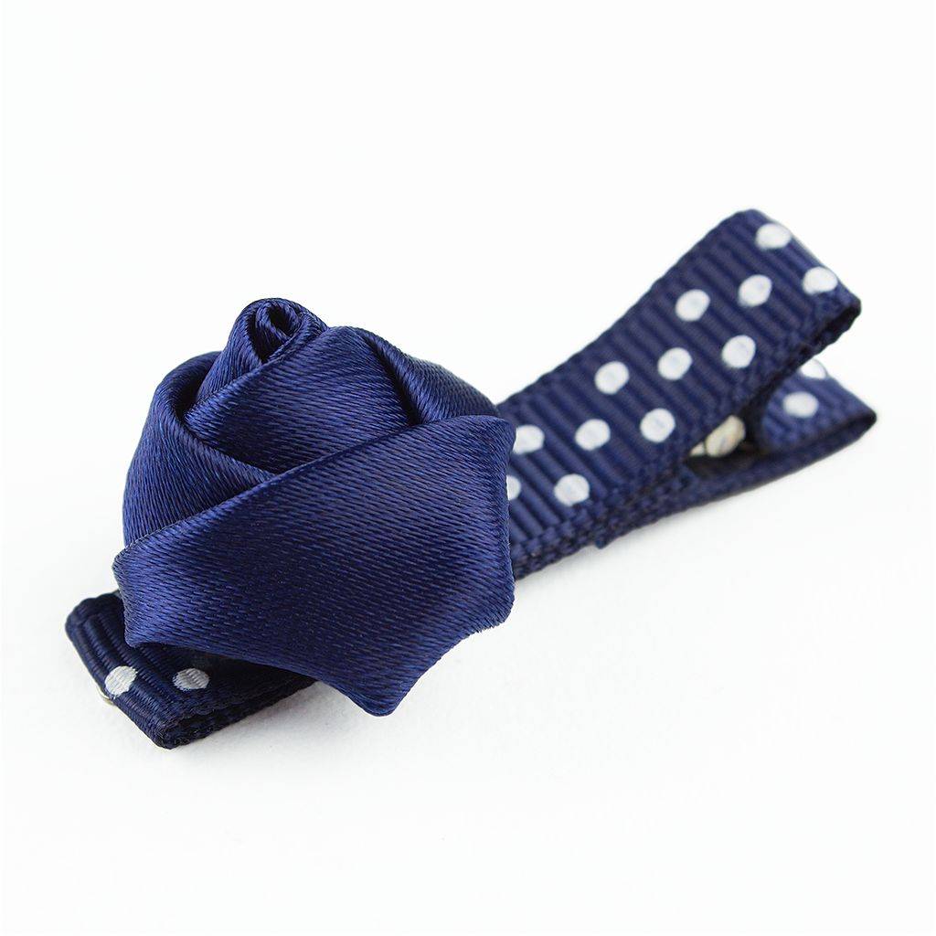 - Mooi donkerblauwgestippeld speldje met een klein donkerblauw satijnen roosje.