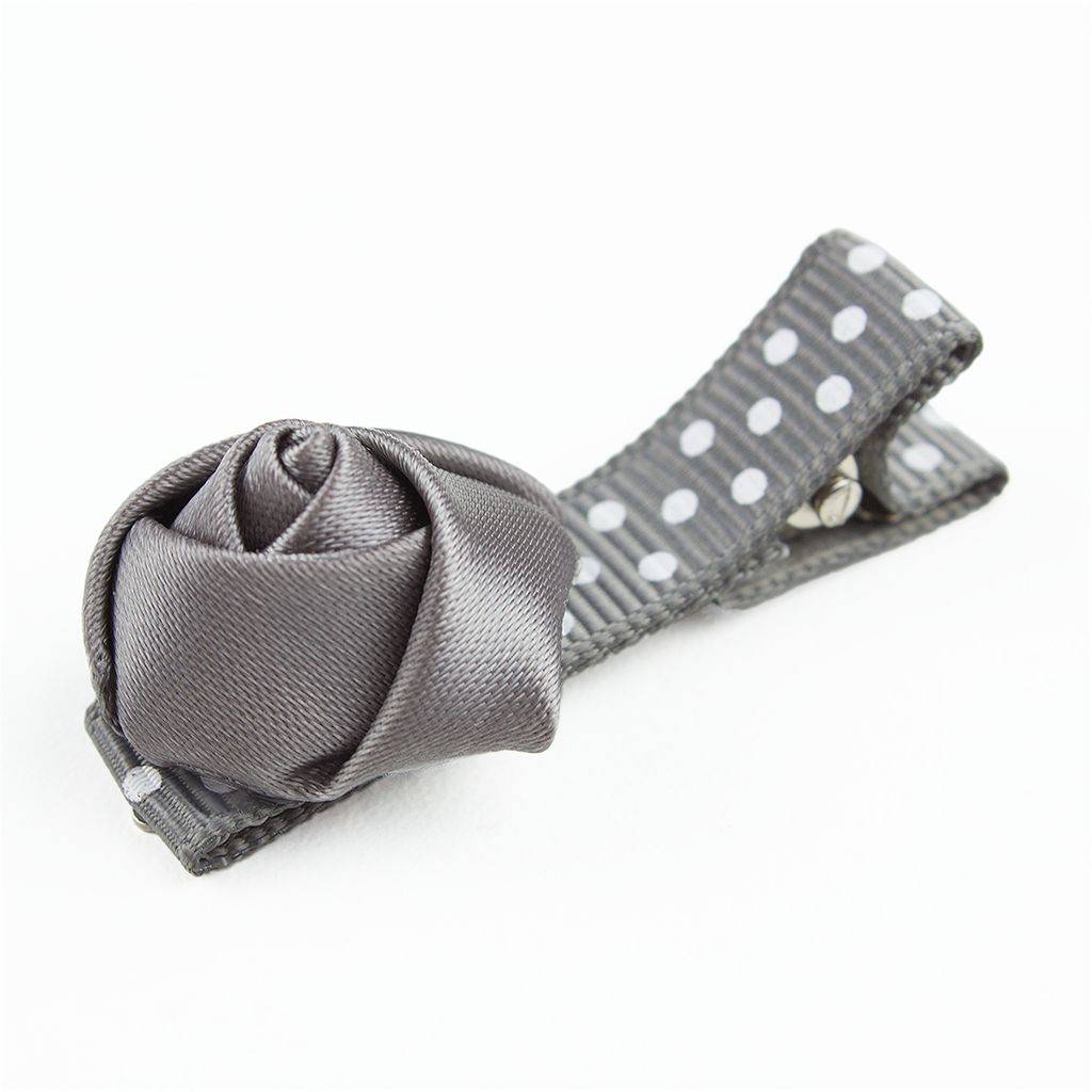 - Mooi grijs gestippeld speldje met een klein grijs satijnen roosje.