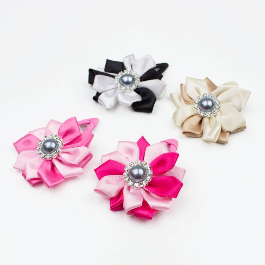 - Mooi speldje met satijnen bloemetje met verschillende kleuren bloemblaadjes en parel applicatie.
