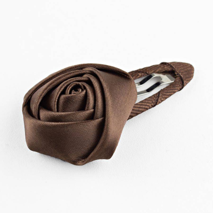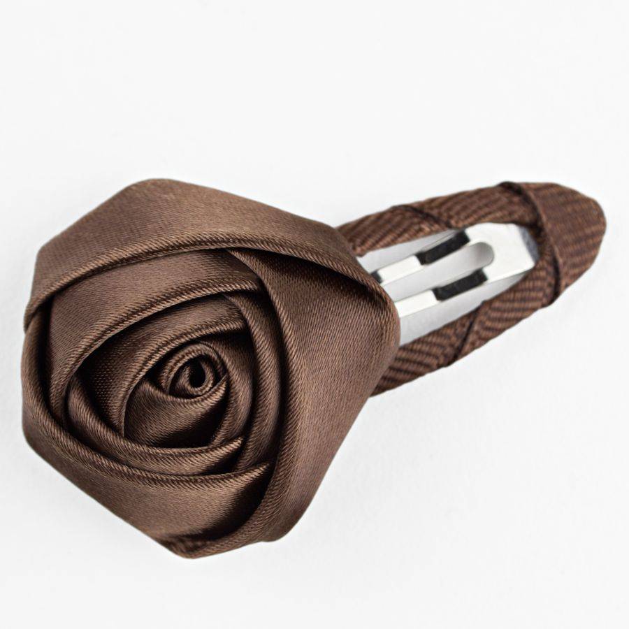 Op het speldje is een bruine, satijnen roos bevestigd. Het roosje is 4 cm in doorsnede.