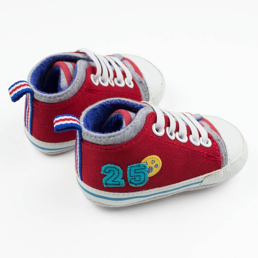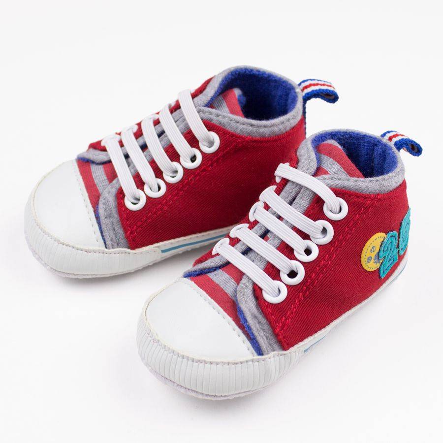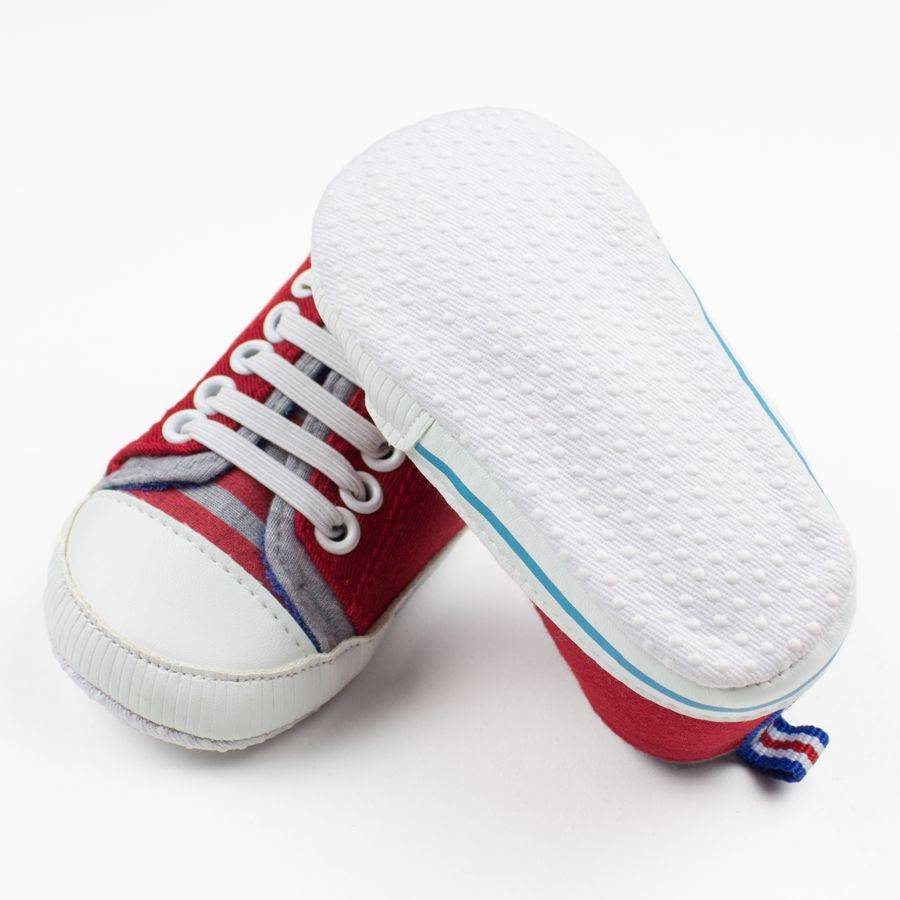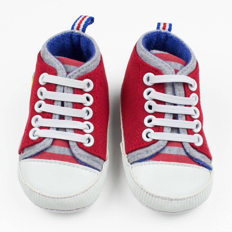 Dit zijn trendy babyschoentjes, namelijk gympen voor een stoere jongen. De gympen sluiten met (nep)vetersluiting op de wreef. De neuzen zijn wit, de rest van de schoen is rood met grijze randen. De flap onder de veters is rood/grijs gestreept. Aan weerszijden van de schoen zit aan de buitenkant een blauwe/gele applicatie. Langs de zool van het schoentje zit een kobaltblauwe streep. De zool is wit met rubberen nopjes om uitglijden te voorkomen.