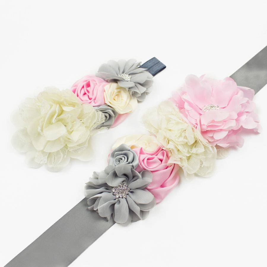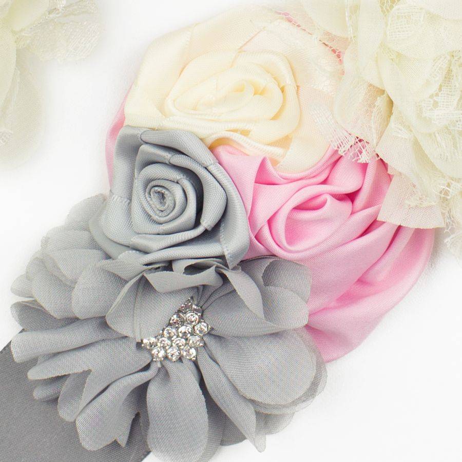 - Op het bandje zitten vijf bloemen in de kleuren off-white, lichtroze en grijs. De eerste bloem is een off-white vintage bloem met tule en opgewerkt kant. Daarnaast zit een grote, lichtroze satijnen bloem met daarop twee grijze en een off-white satijnen roosjes. Daarnaast zit een grijze margriet met een grote strass steen in het hart.