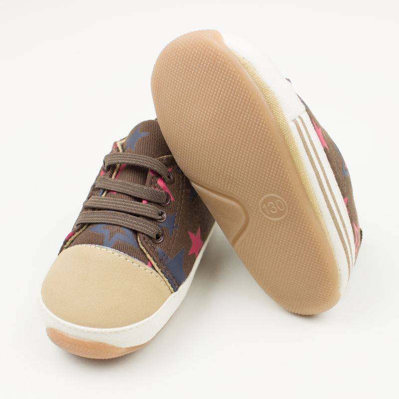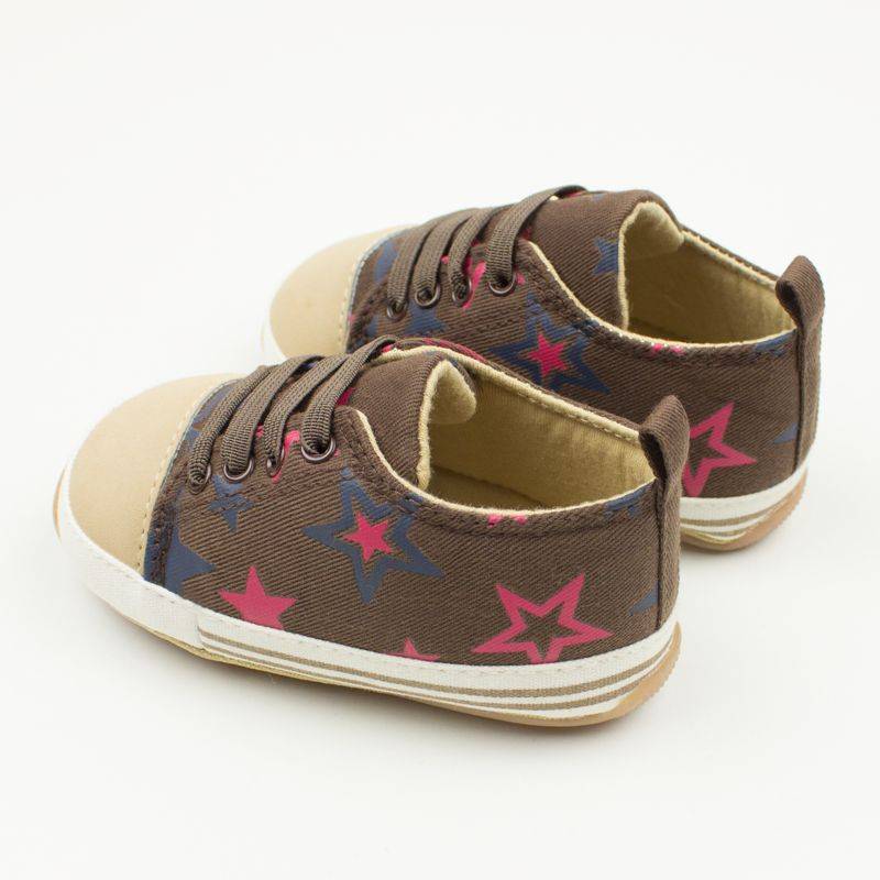Het babyschoentje is donkerbruin met oranje en petrol sterren. De neus van het schoentje is gemaakt van lichtbruin, suedine stof Er zitten vier rijen veters in de schoen, deze zijn nep. Door de ealstiek makkelijk aan en uit te trekken. Aan de zijkant van de schoen zit een brede off-white band met twee lichtbruine strepen. Het schoentje is gevoerd met lichtbruine stof en heeft een zacht binnenzooltje.