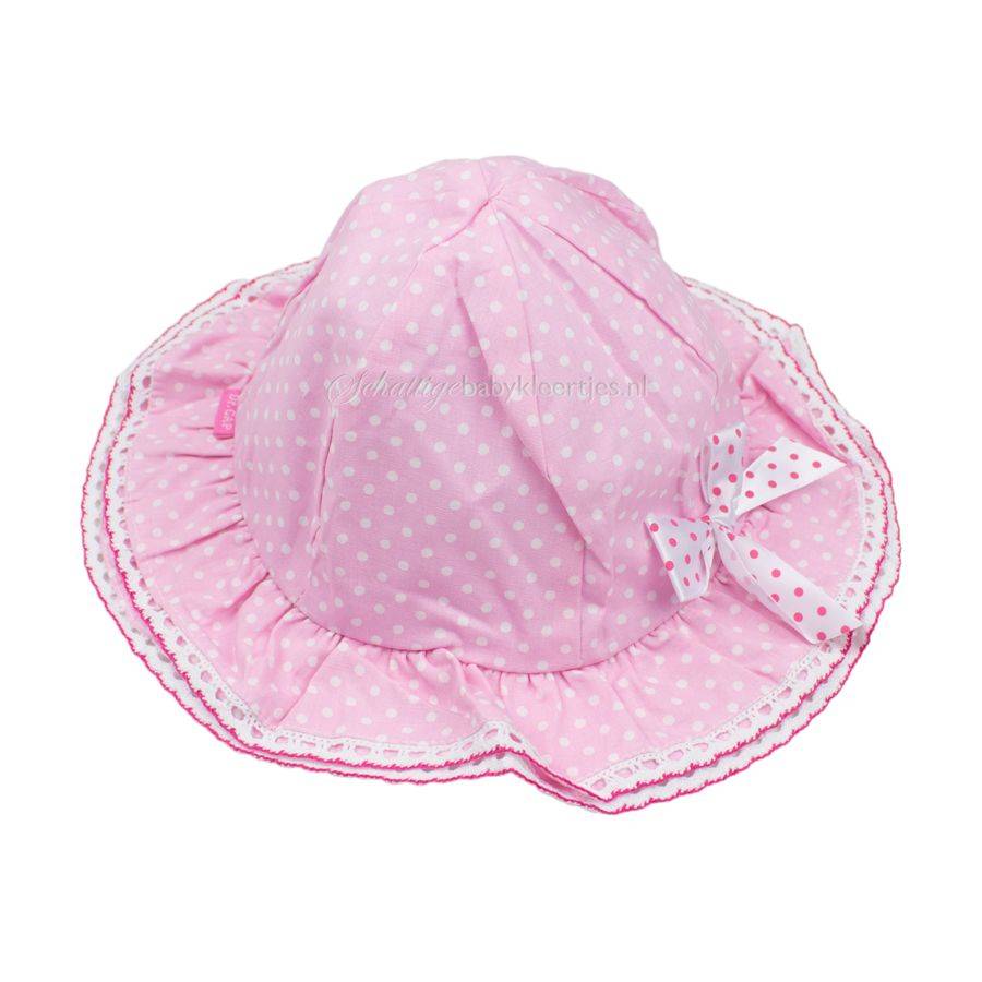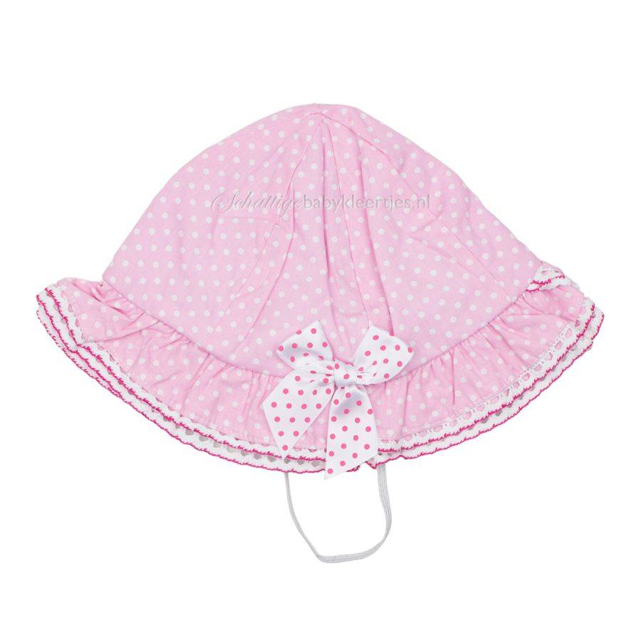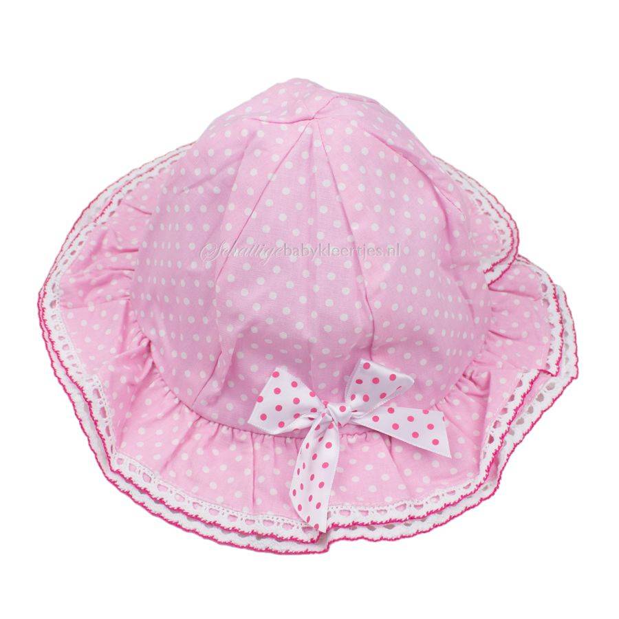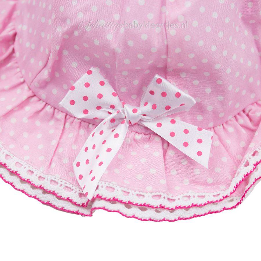 BESCHRIJVINGDit is een superschattig zonnehoedje voor een baby met kledingmaat 74 t/m 86. Het hoedjes is gemaakt van 100% katoen, draagt comfortabel in de zomer. Het hoedje is lichtroze met witte stippeltjes. Het heeft aan de onderkant een dubbele strook met plooitjes en aan beide stroken een rand met wit opengewerkt kant en een roze randje. Op het zonnehoedje zit een witte satijnen strik met roze stippeltjes. Het zonnehoedje is keurig gevoerd met een witte voering en heeft een wit, smal elastieke bandje die u om de kin kan doen. U kunt dit bandje ook naar binnen vouwen en het hoedje zonder bandje laten dragen.